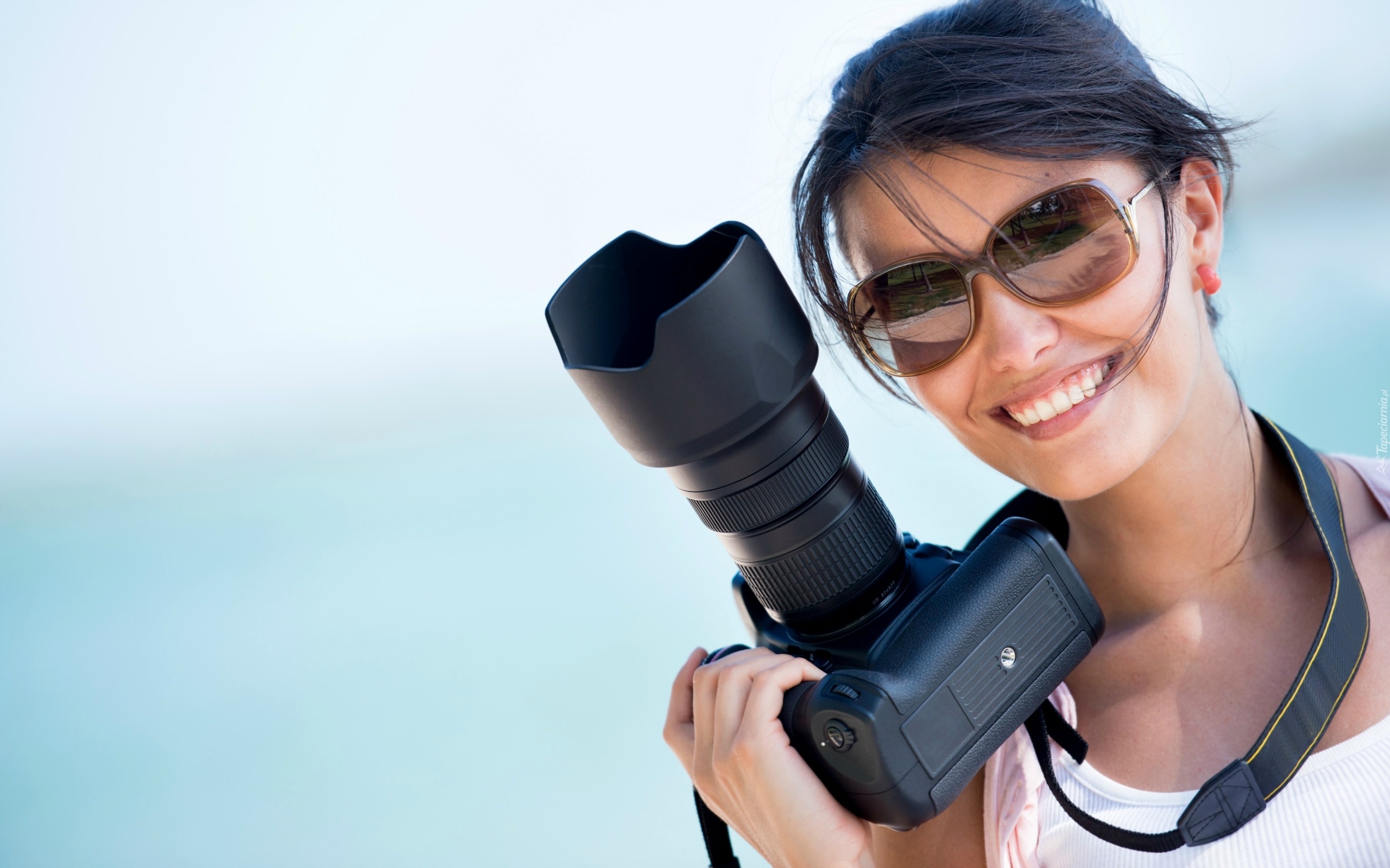 Edytor tapety: Kobieta, Uśmiech, Okulary, Aparat, Fotograficzny