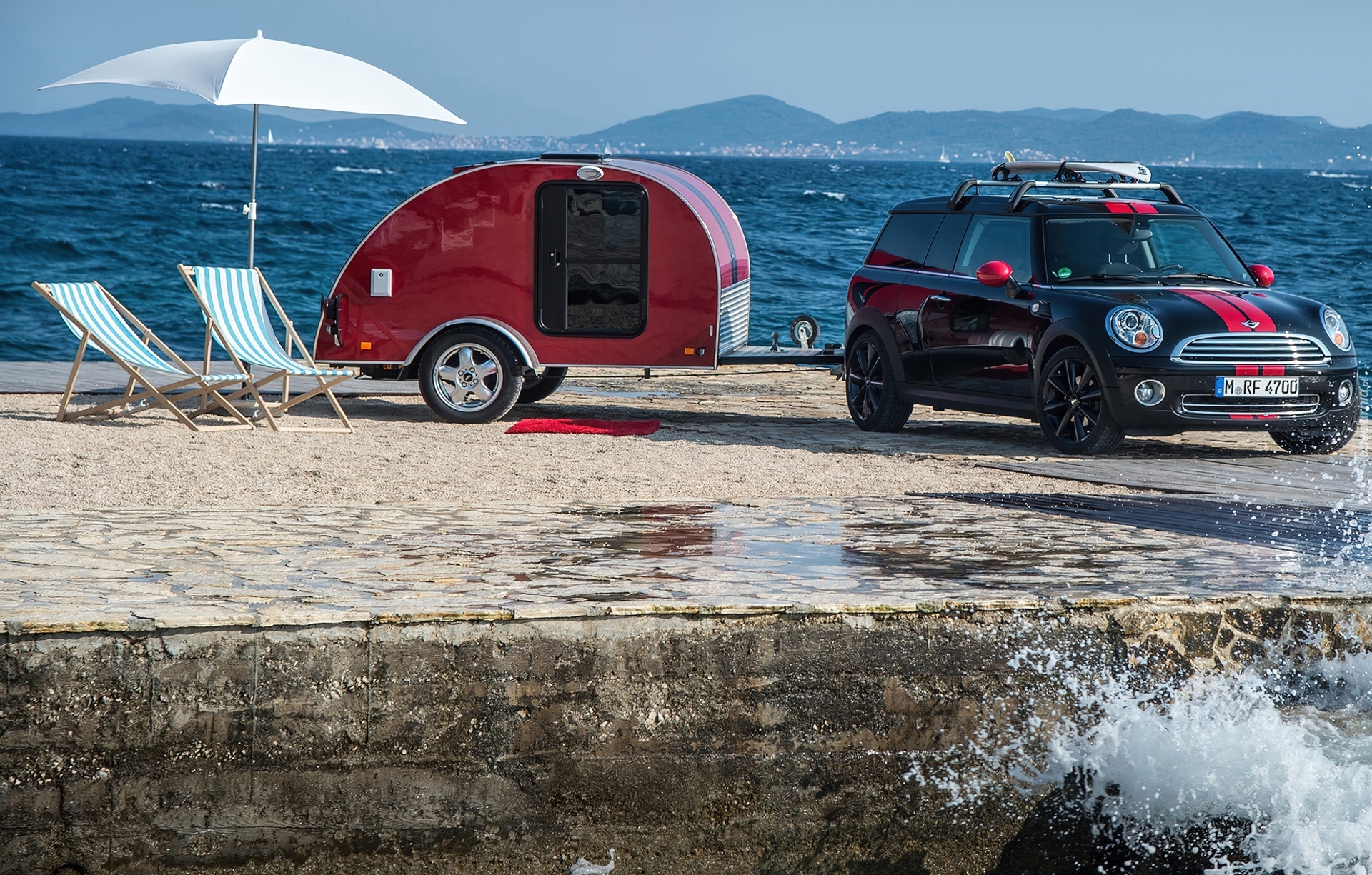 Edytor tapety: Samochód, MINI, Przyczepka, Leżaki, Jezioro
