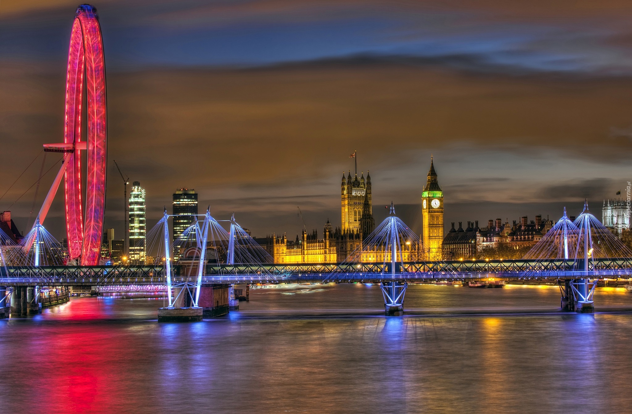 Edytor tapety: Pałac Westminster, Big Ben, London Eye, Most, Tamiza