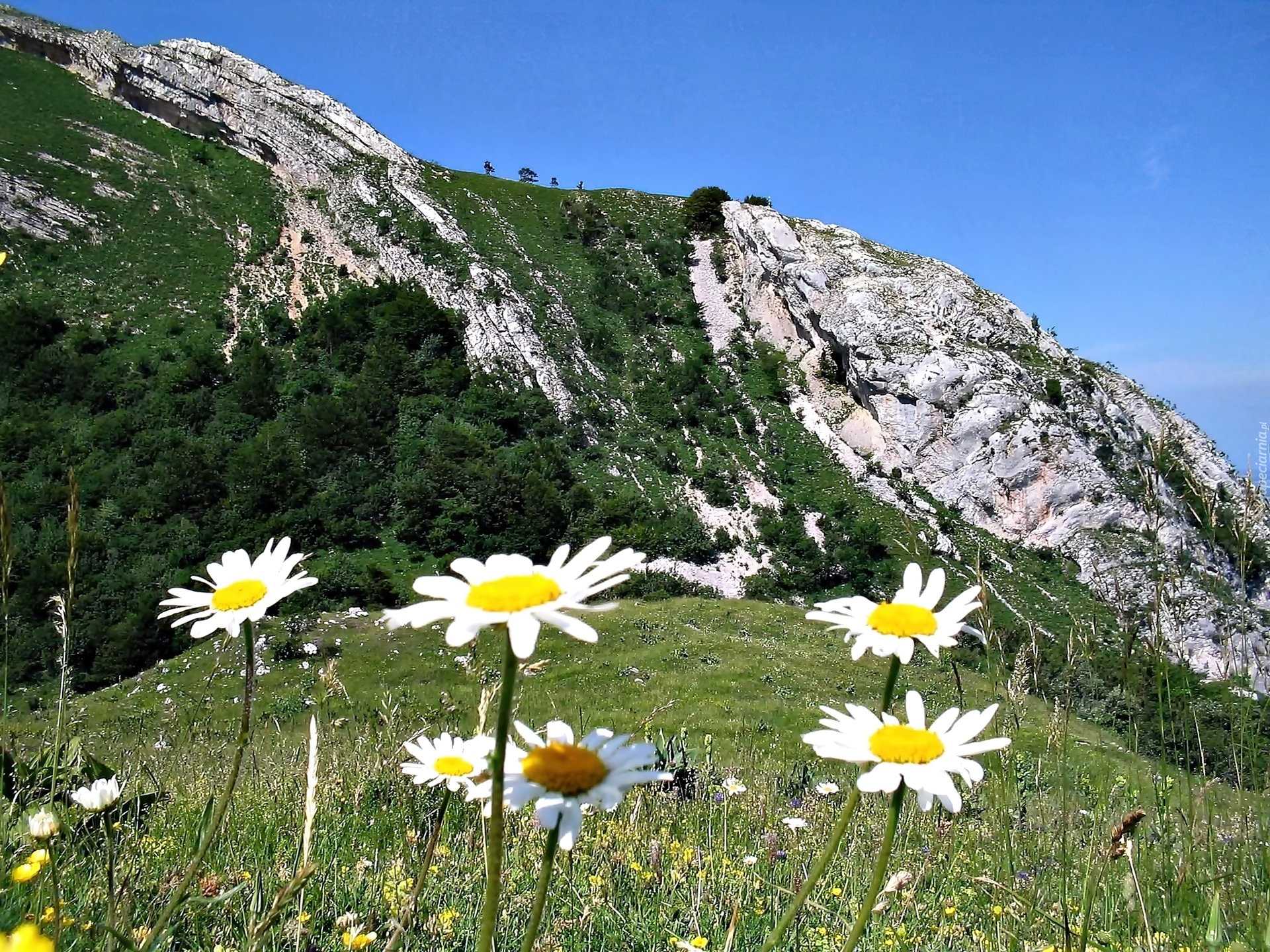 Edytor tapety: Góry, Las, Łąka, Margerytki