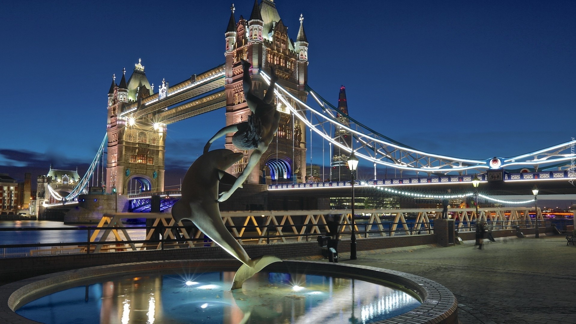 Edytor tapety: Anglia, Most, Tower Bridge, Fontanna, Delfin