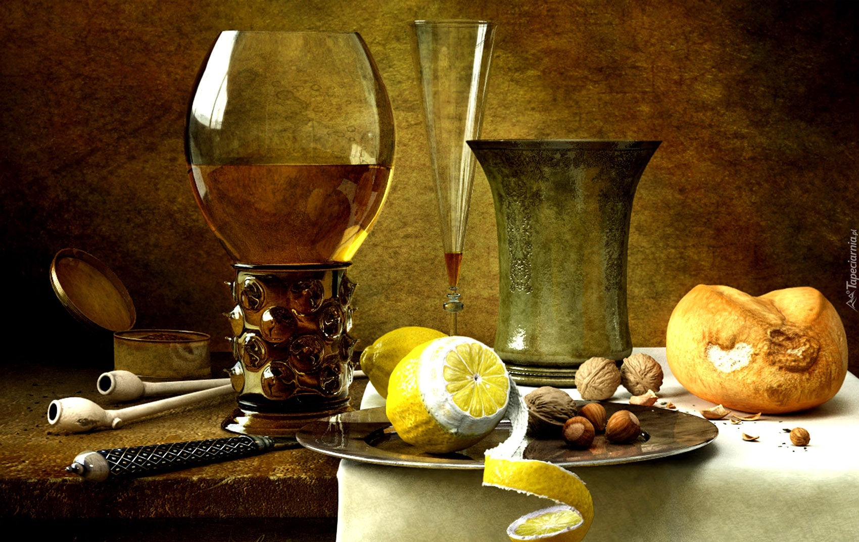 Edytor tapety: Obraz, Kornel, Ravaditis, Orzechy, Cytryna, Bułka, Wino, Kieliszki