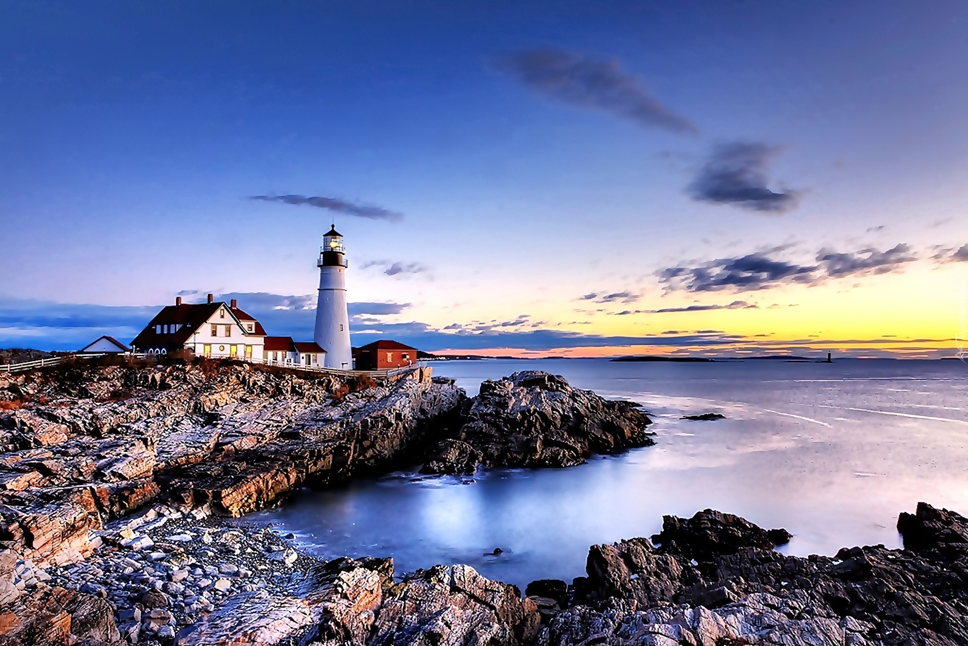 Edytor tapety: Wschód, Słońca, Morze, Skały, Latarnia, Morska, Domy