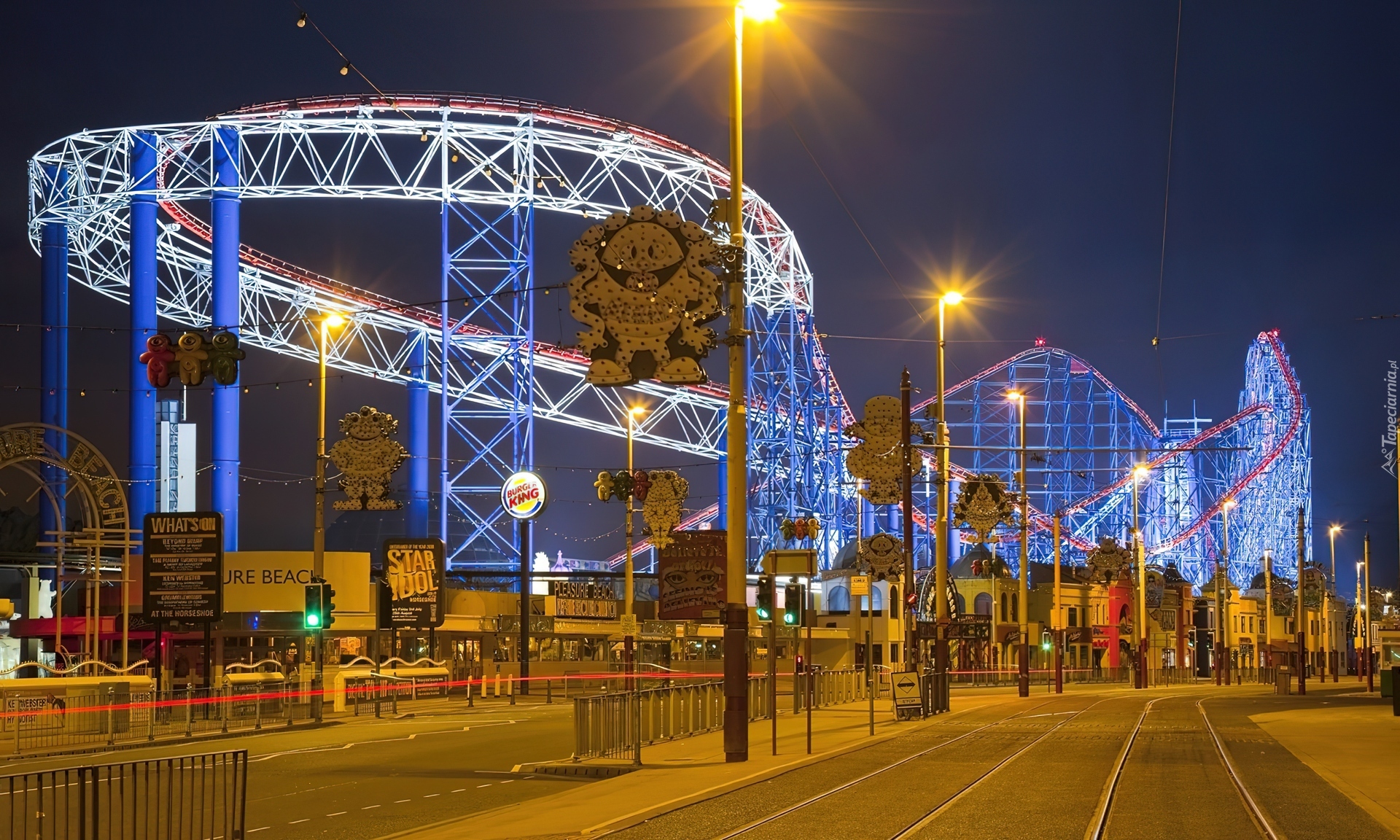Edytor tapety: Kolejka, Nocą, Nad, Miastem, Konstrukcja, Latarnie, Ulica