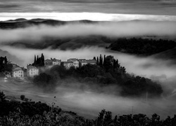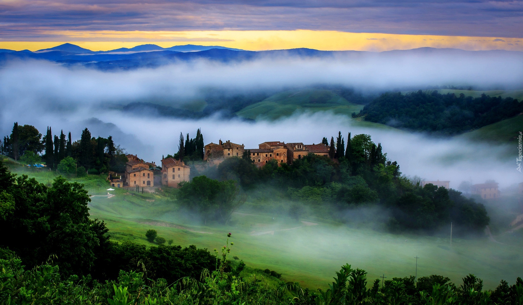 Edytor tapety: Toskania, Włochy, Mgła, Wschód Słońca, Budynki