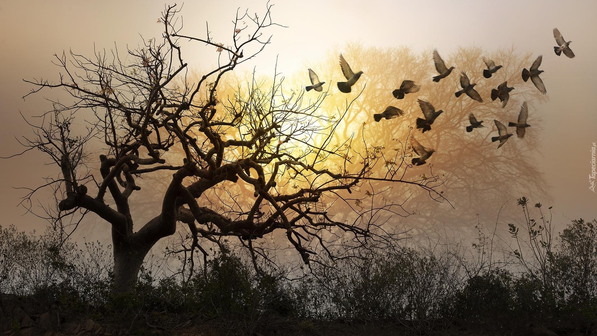 Edytor tapety: Drzewo, Ptaki, Przebijające, Światło