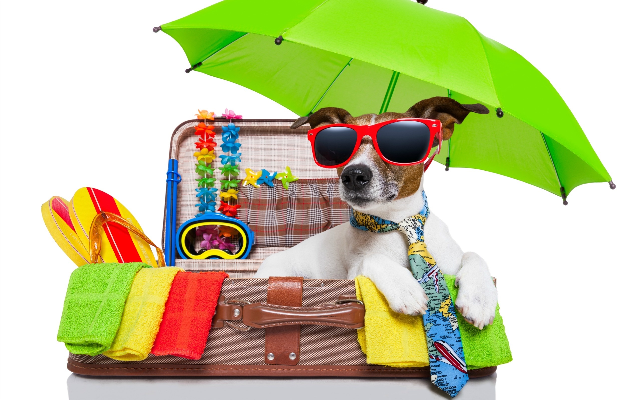 Edytor tapety: Okulary, Parasol, Waliza, Wakacje, Jack russell terrier