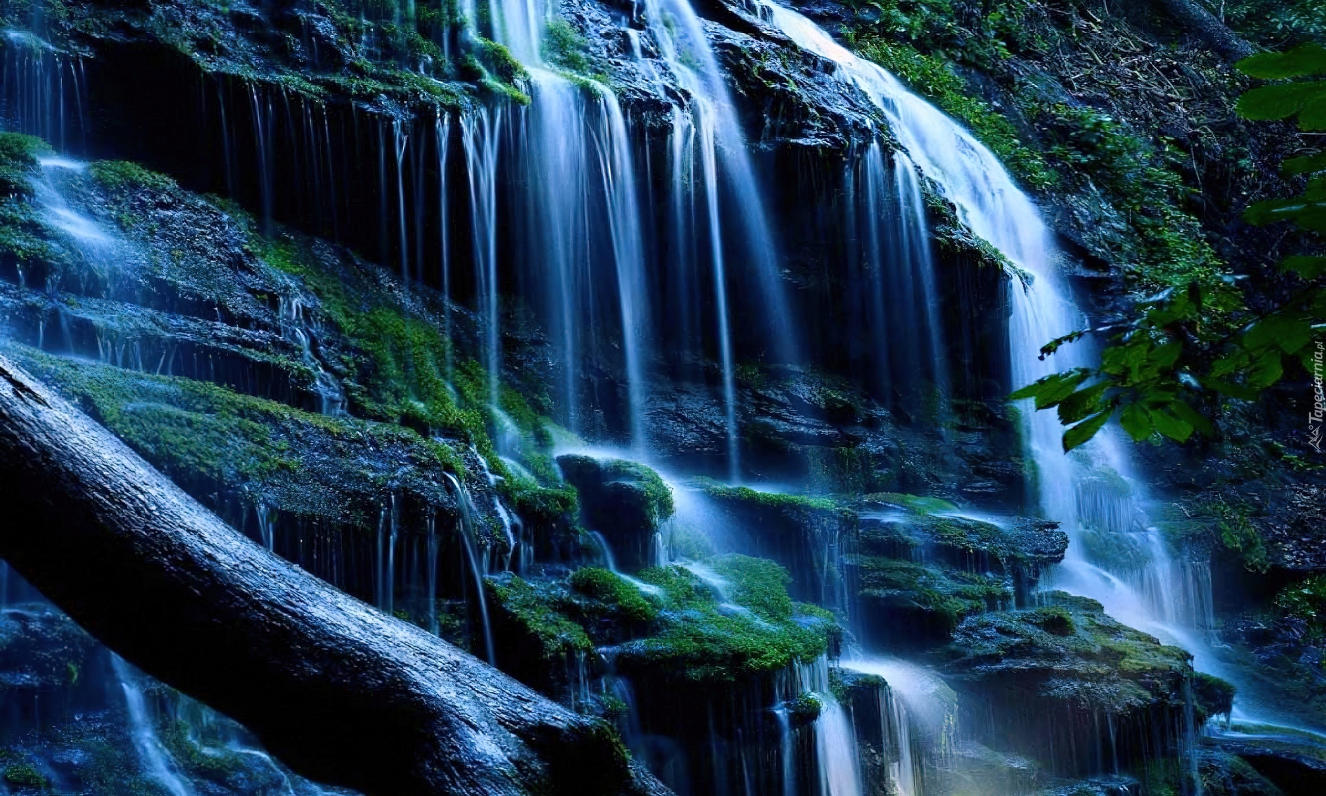 Edytor tapety: Wodospad, Nocą, Mchy, Konar, Drzewa