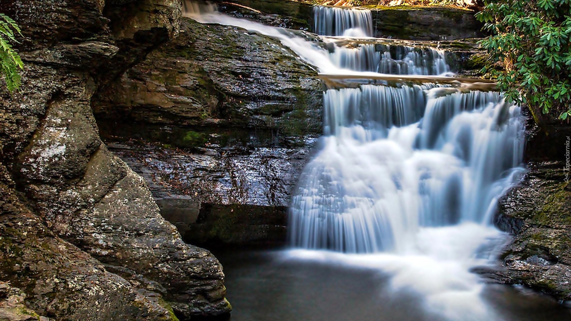 Edytor tapety: Wodospad, Skały, Liście