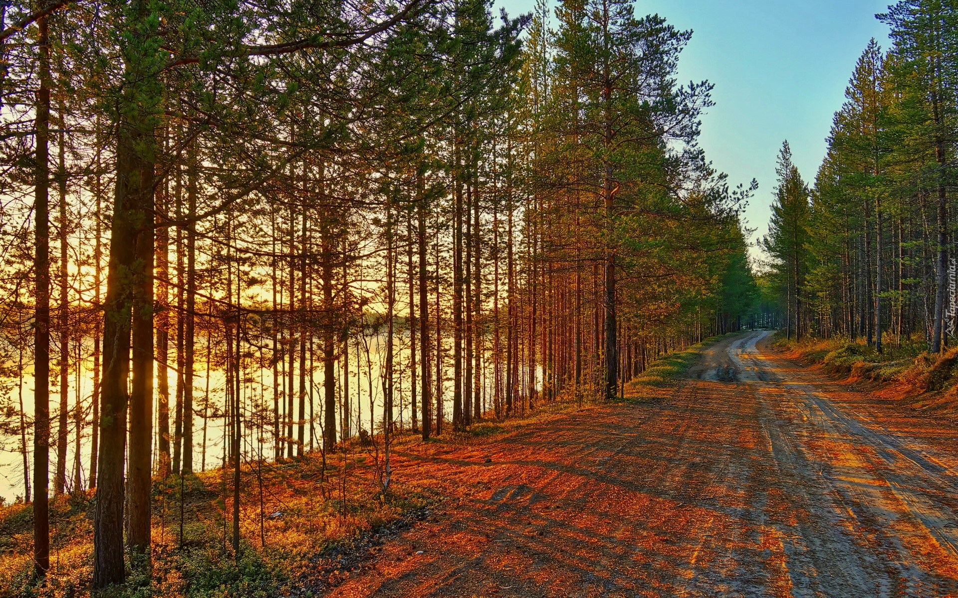 Edytor tapety: Droga, Drzewa, Jezioro, Jesień