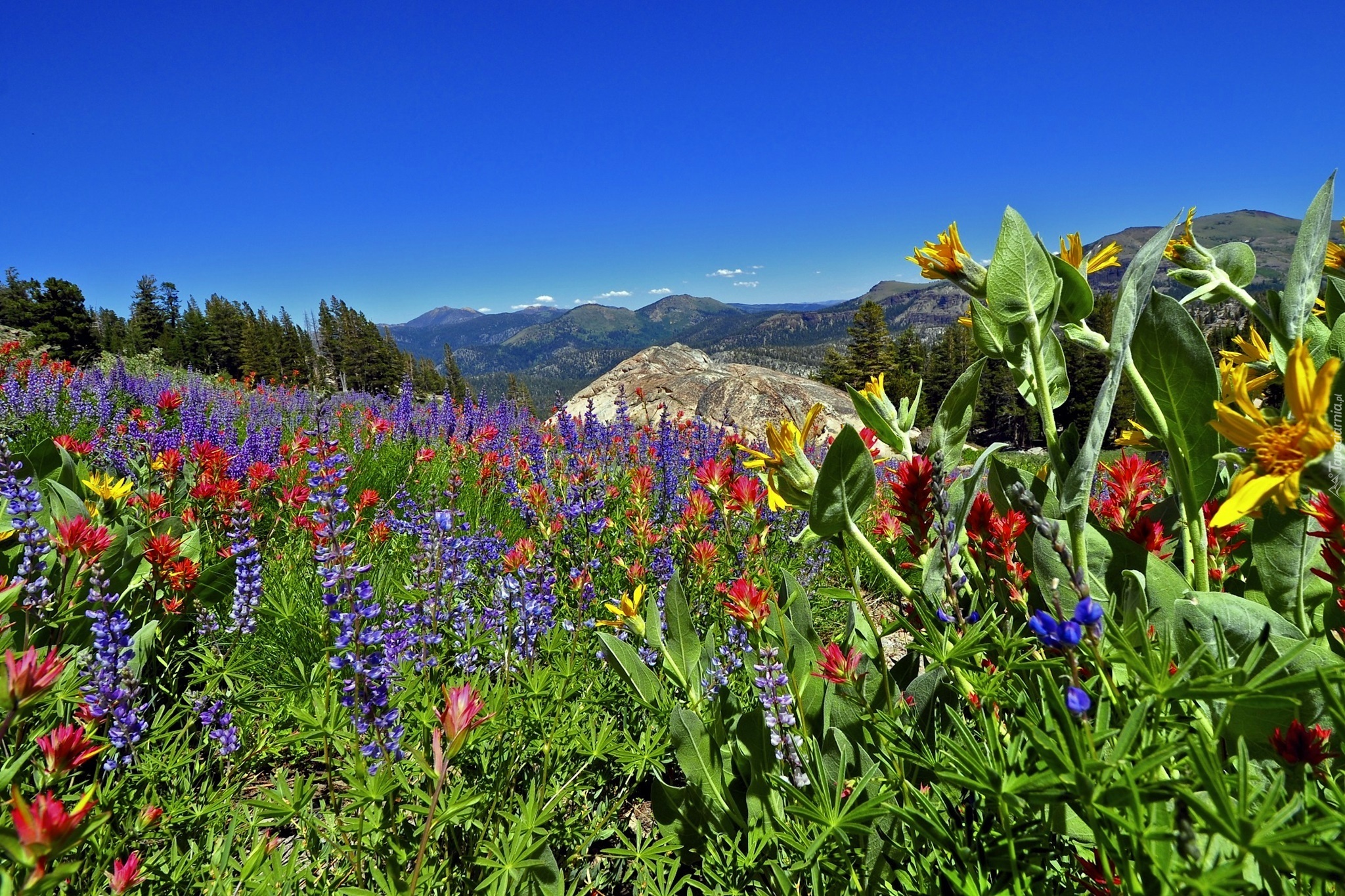 Edytor tapety: Sierra Nevada, Kalifornia, Kwiaty, Góry, Łąka