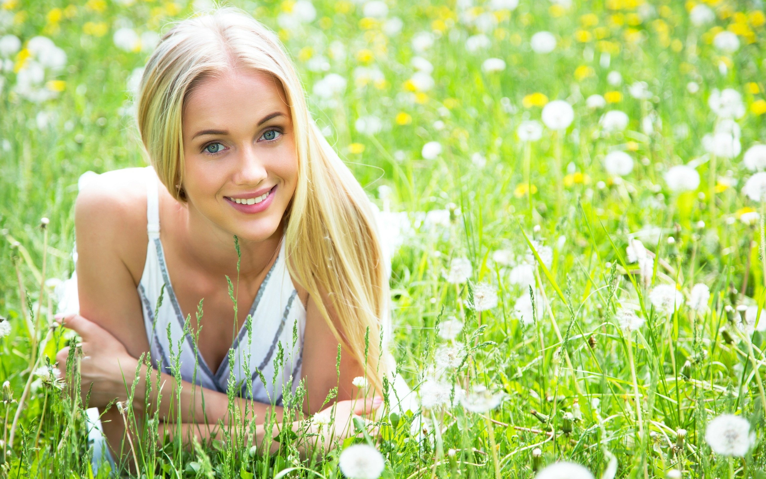 Edytor tapety: Uśmiechnięta, Blondynka, Łąka, Mlecze