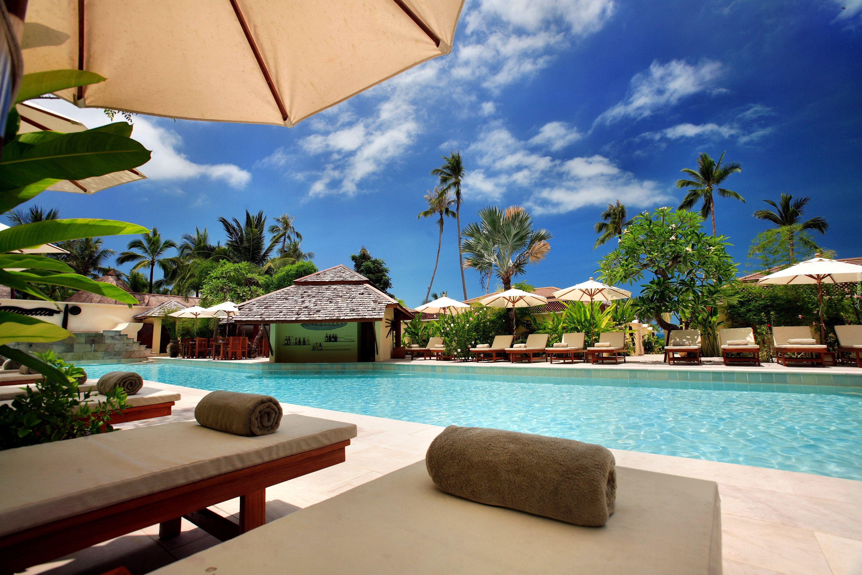 Edytor tapety: Basen, Leżaki, Bar, Tropik, Wakacje, Parasole
