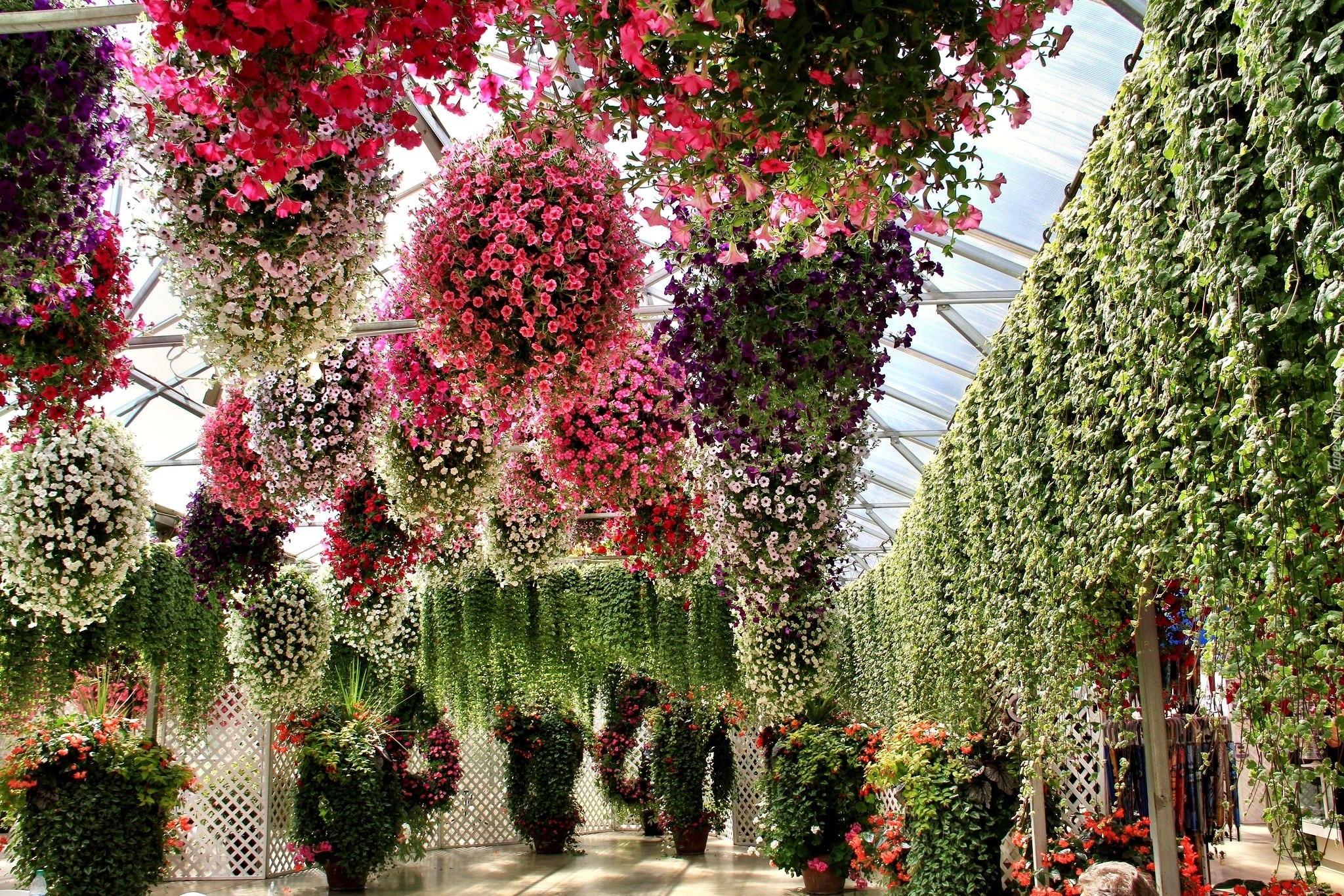 Edytor tapety: Ogród Botaniczny, Kolorowe, Wiszące, Surfinie