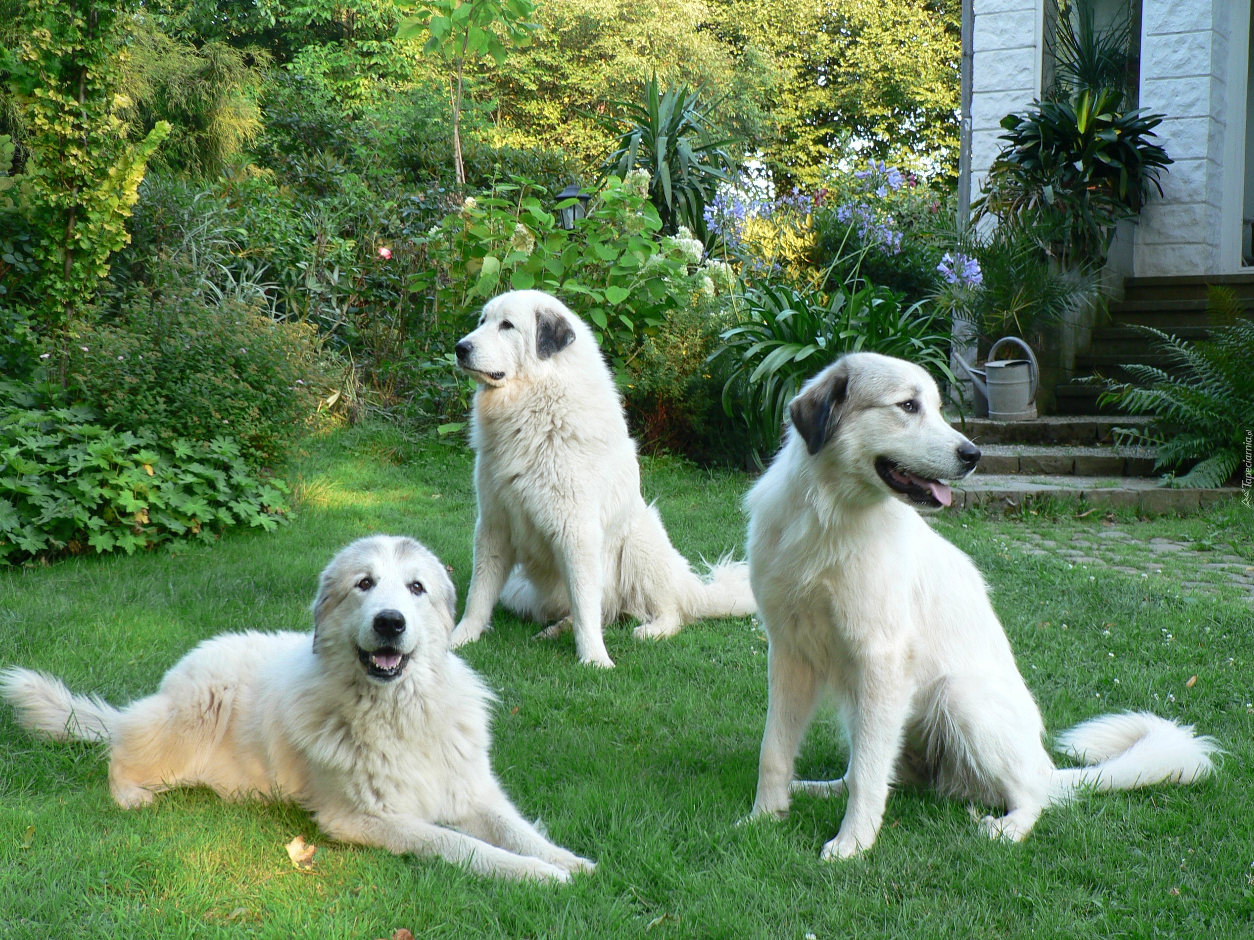 Edytor tapety: Trzy, Pirenejskie Psy Górskie, Ogród