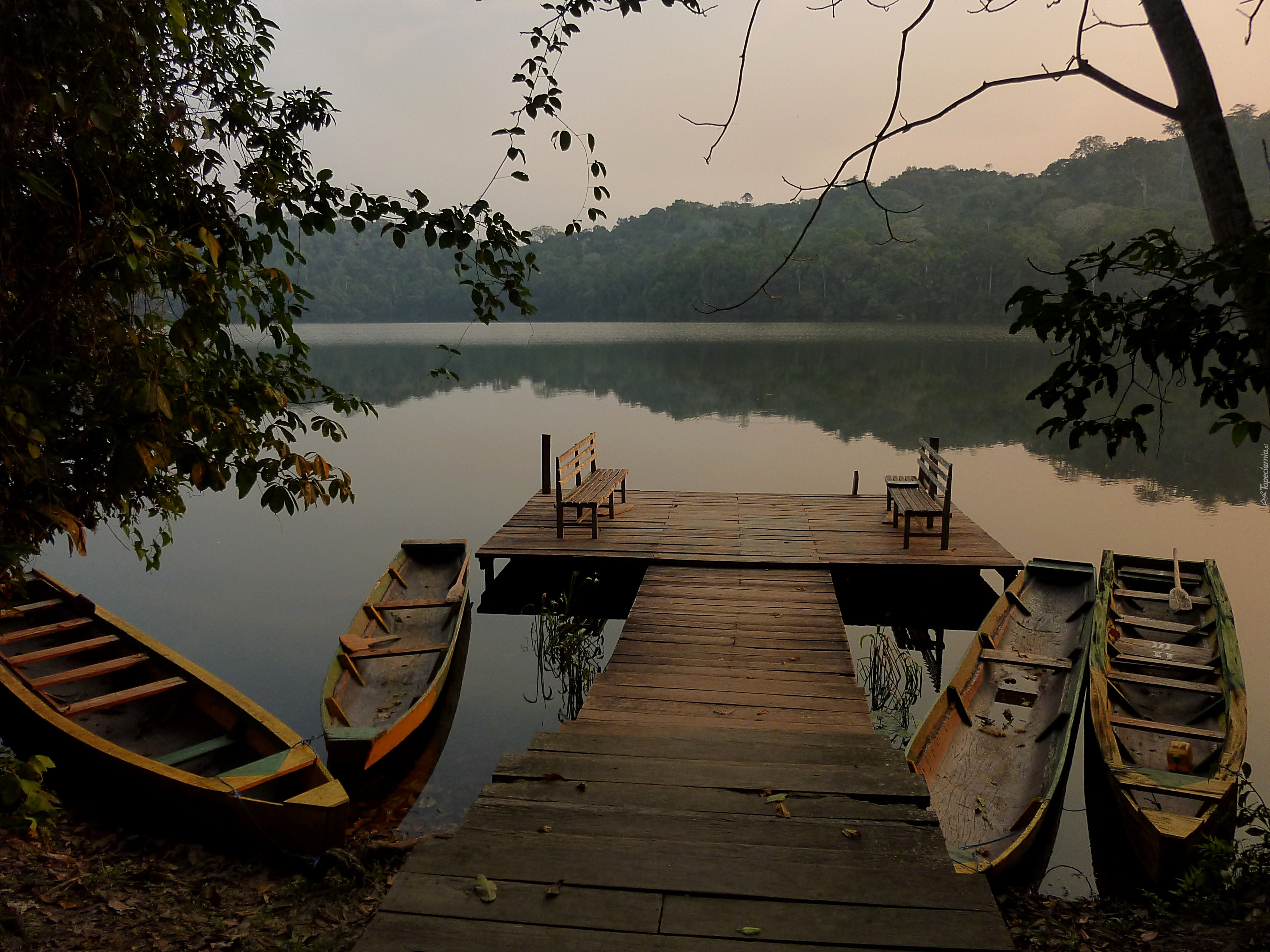 Edytor tapety: Łódki, Jezioro, Zmierzch, Pomost, Ławki, Drzewa