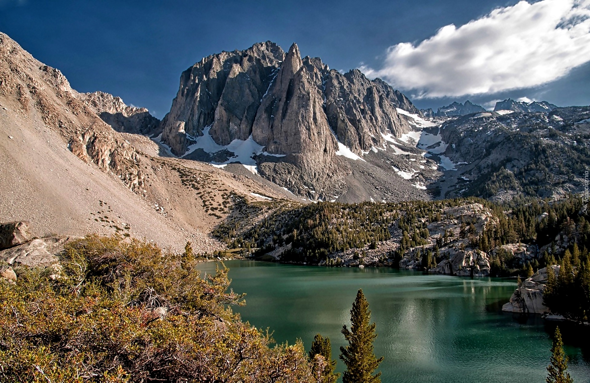 Edytor tapety: Góry, Jeziorko, Śnieg, Drzewa