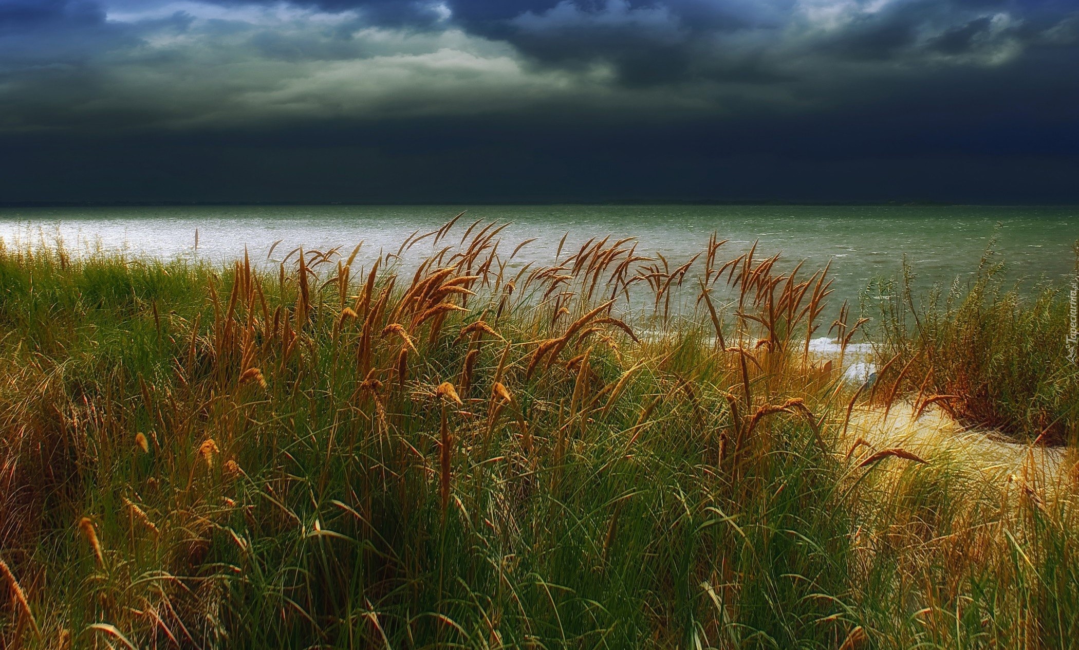 Edytor tapety: Wybrzeże, Wysokie, Trawy, Ciemne, Chmury