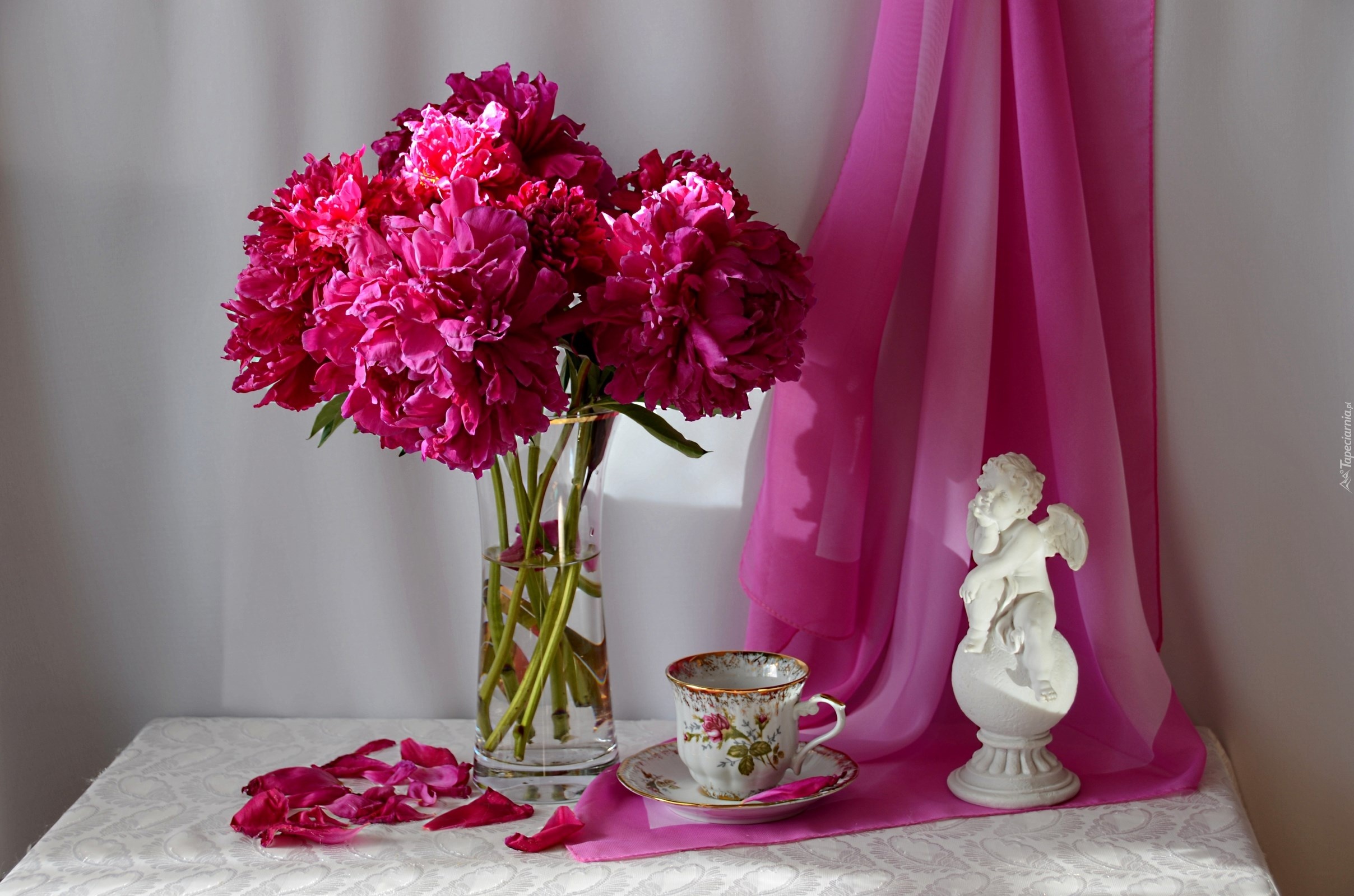 Edytor tapety: Piwonie, Figurka, Amorek, Kompozycja