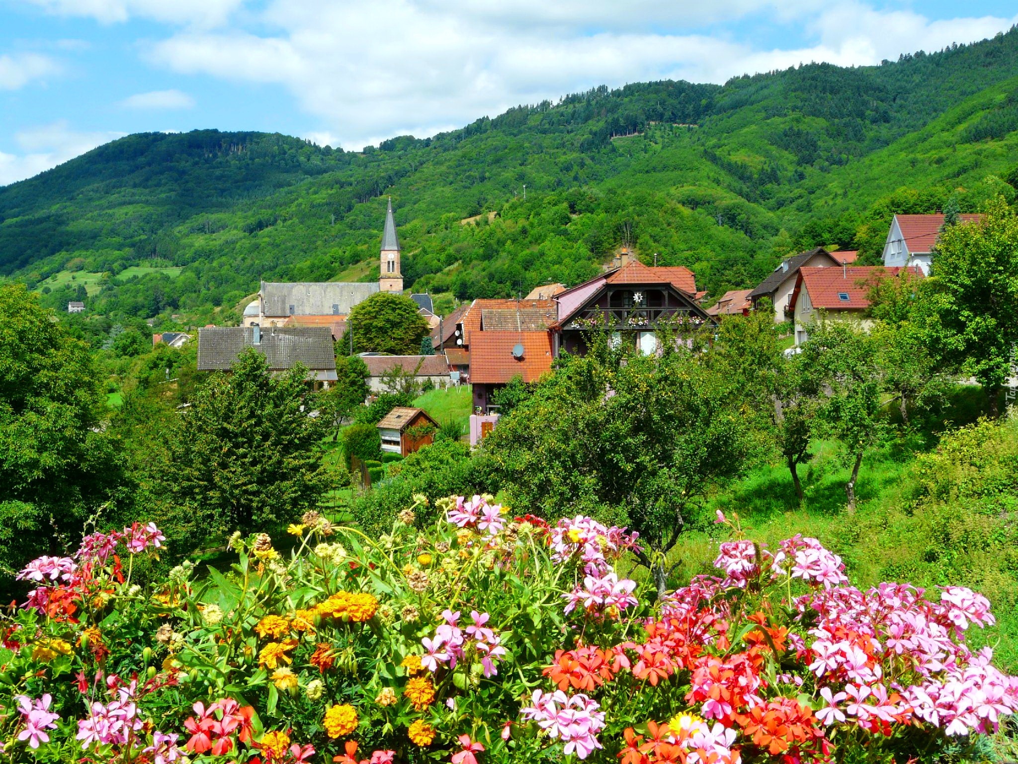 Edytor tapety: Miasteczko, Góry, Kwiaty