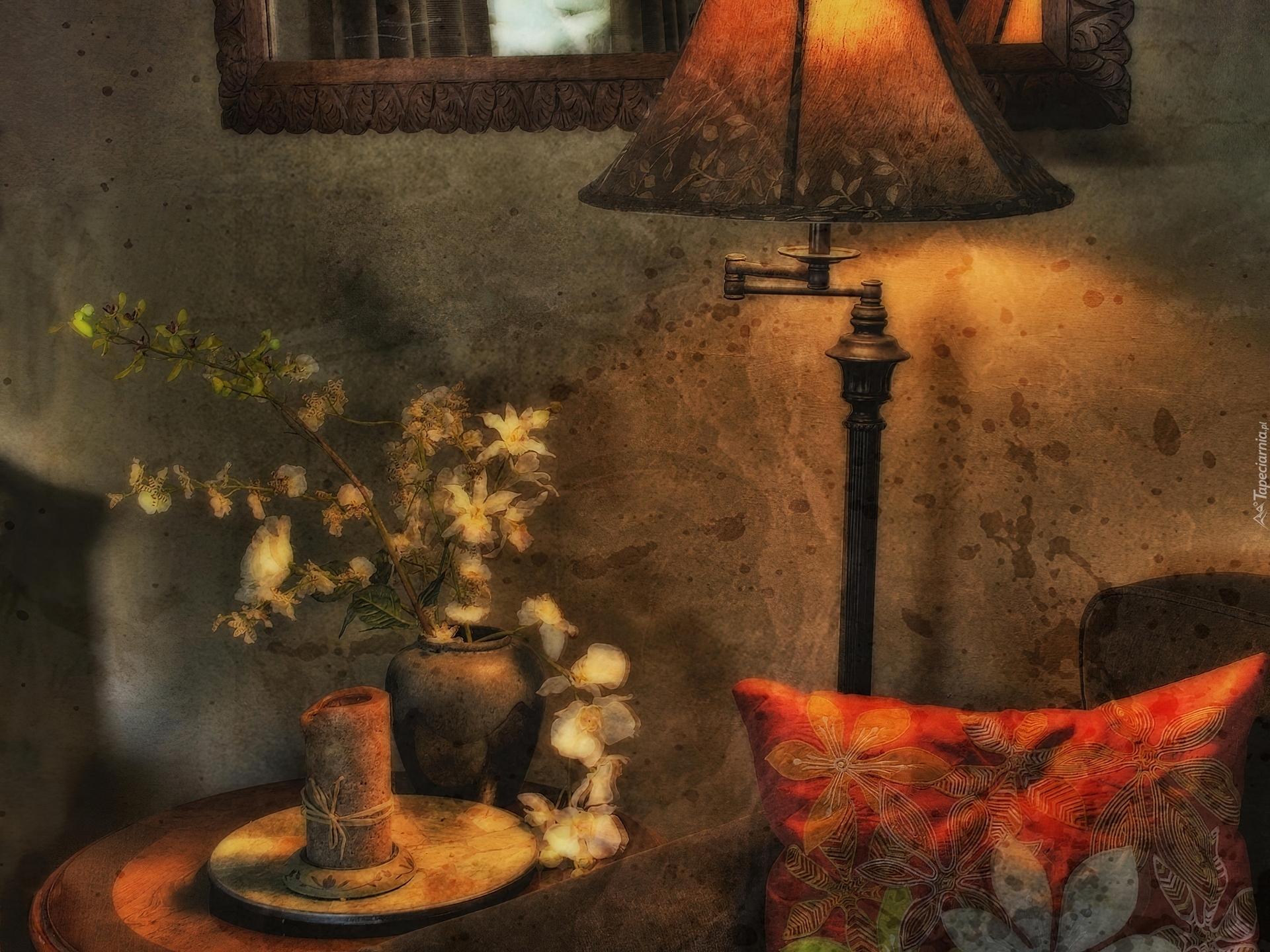Edytor tapety: Pokój, Lampa, Poduszka, Wazon, Kwiaty