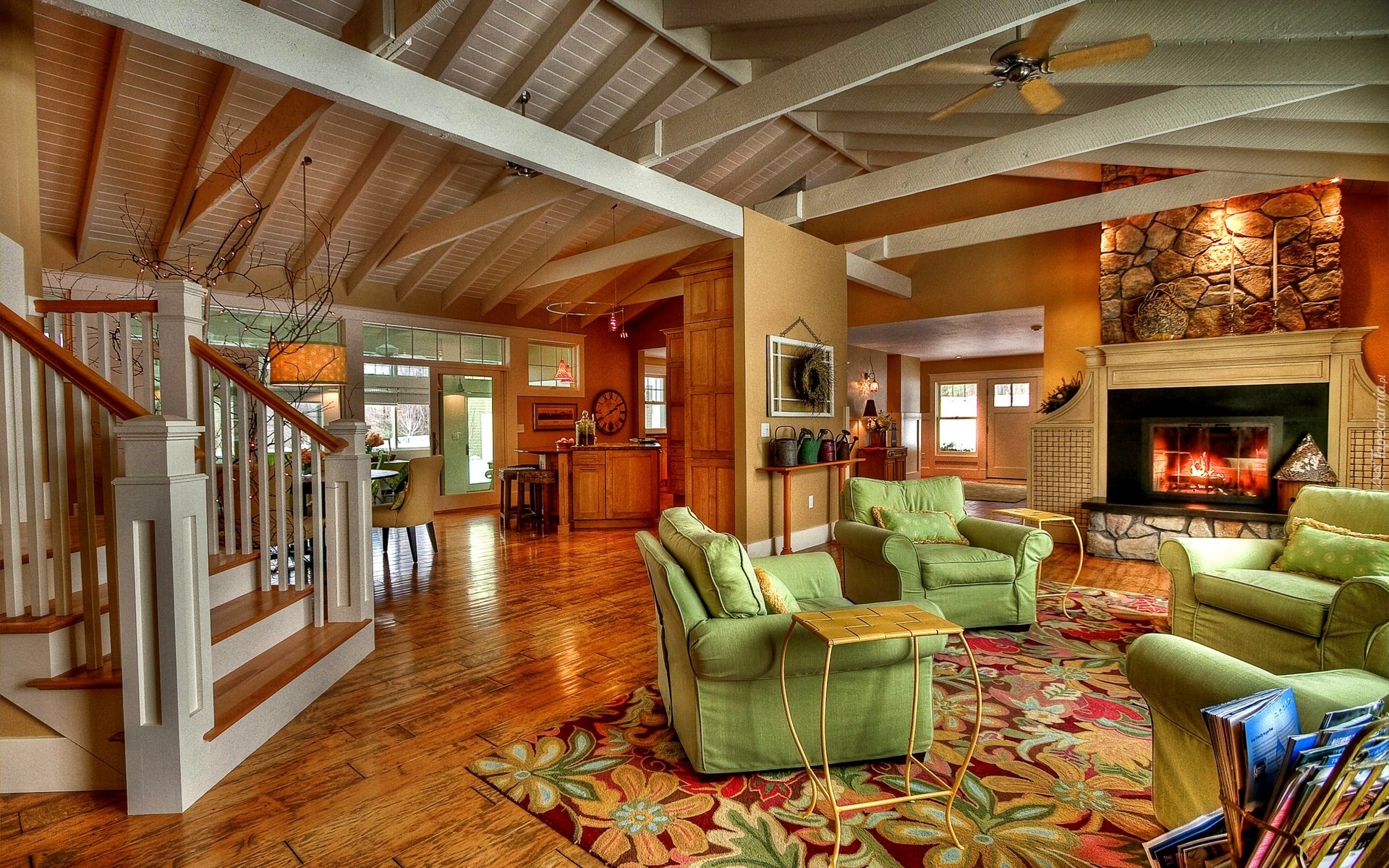 Edytor tapety: Salon, Kominek, Schody, Zielone, Fotele