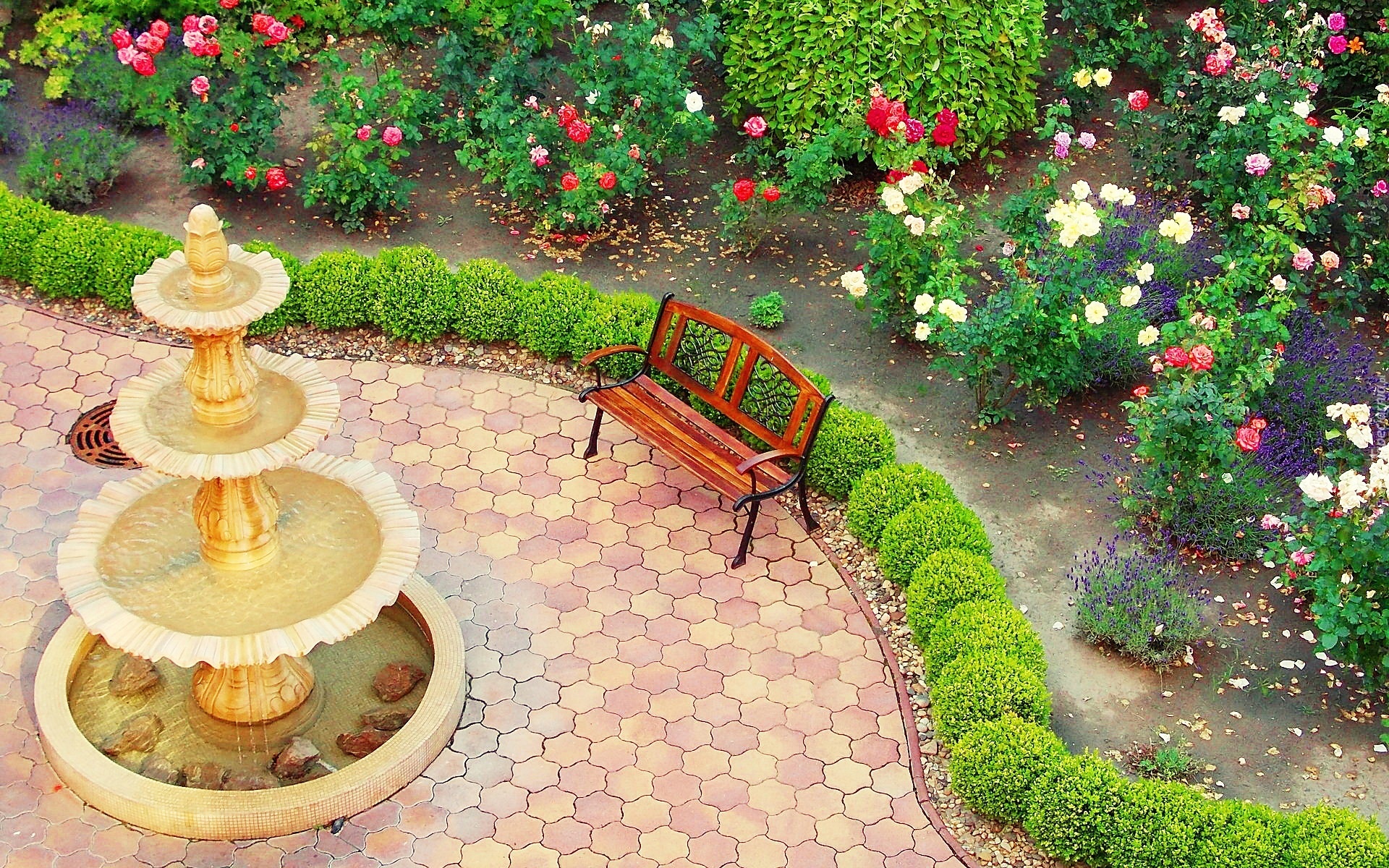 Edytor tapety: Różany, Ogród, Fontanna, Ławka