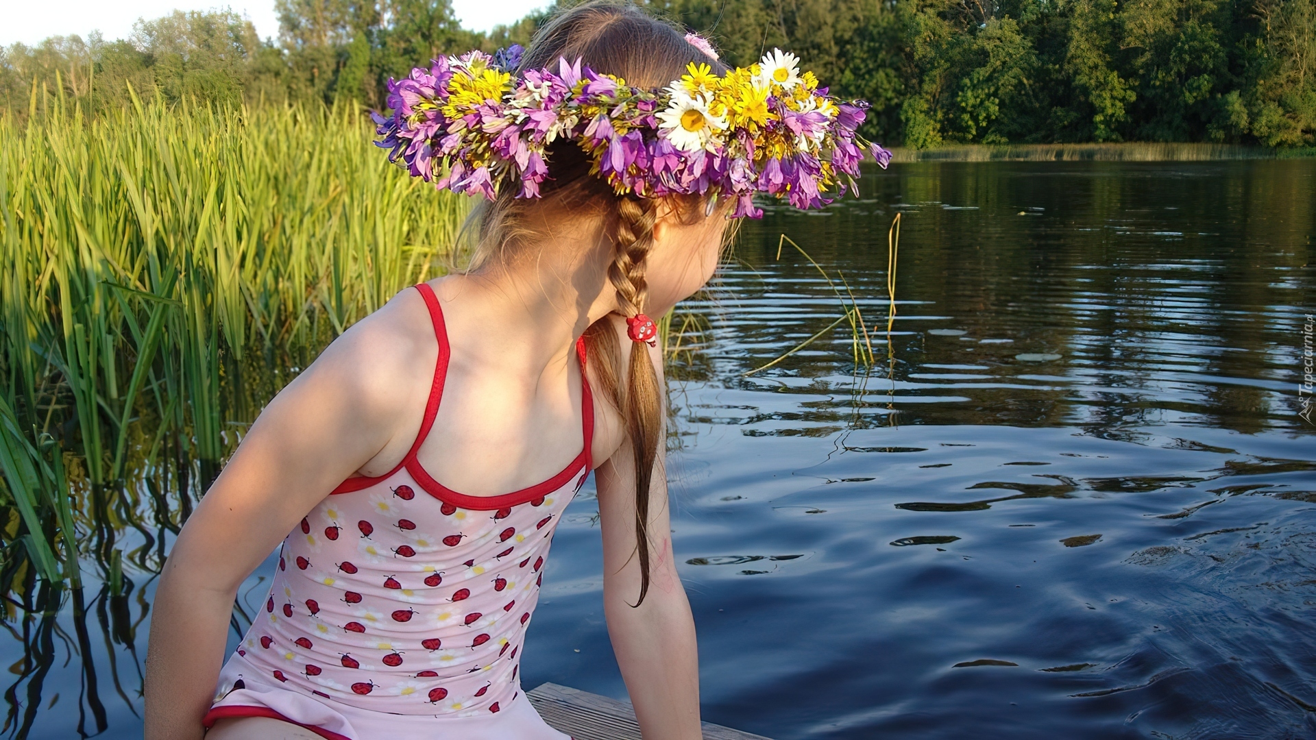 Edytor tapety: Dziecko, Dziewczynka, Wianek, Kwiaty, Jezioro