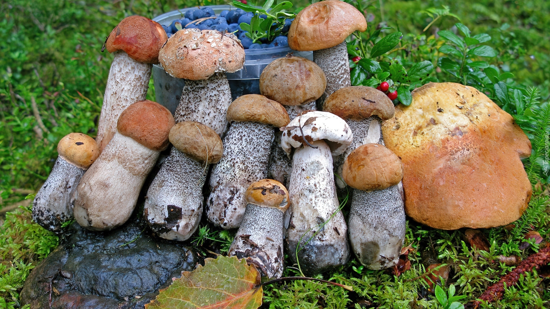 Edytor tapety: Grzyby, Jagody, Wiaderko, Kraśniak, Liście, Mech