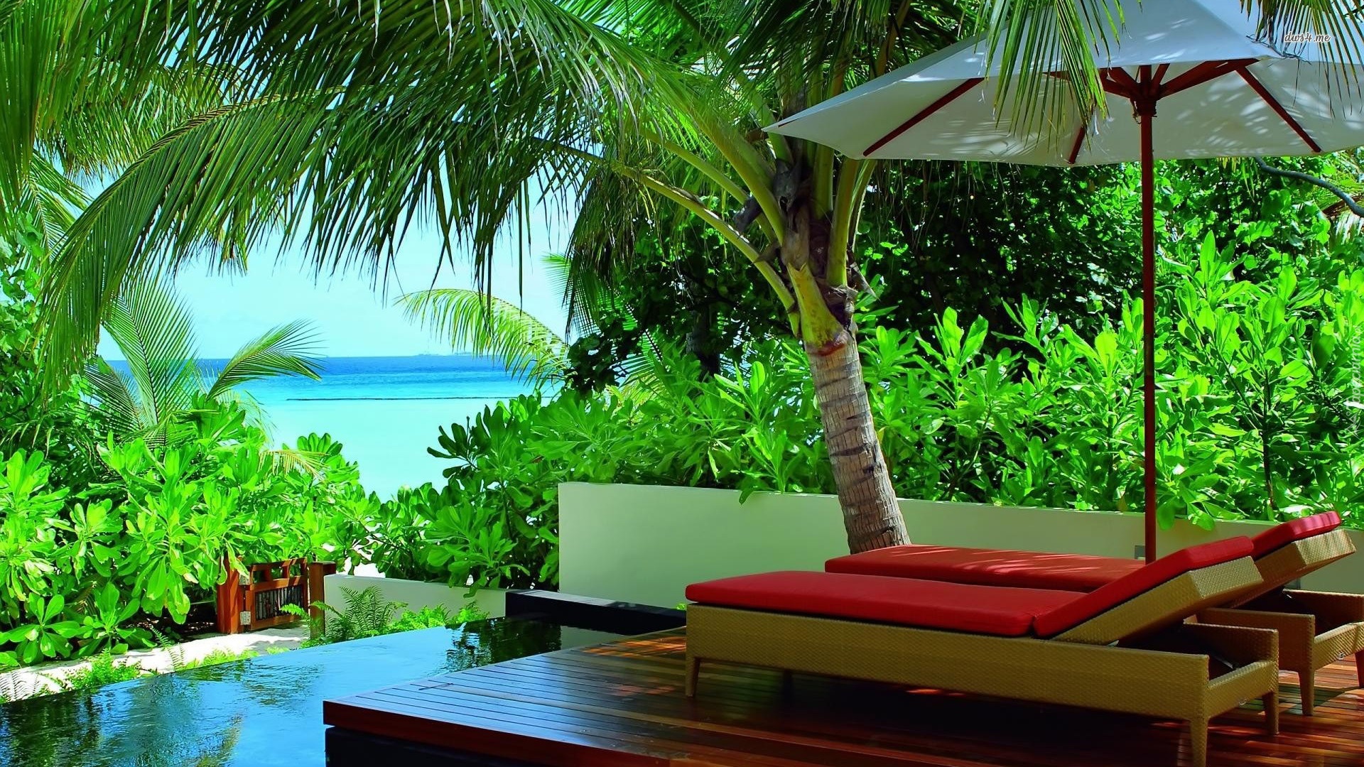 Edytor tapety: Taras, Leżaki, Palmy, Morze, Basen, Parasol, Wakacje