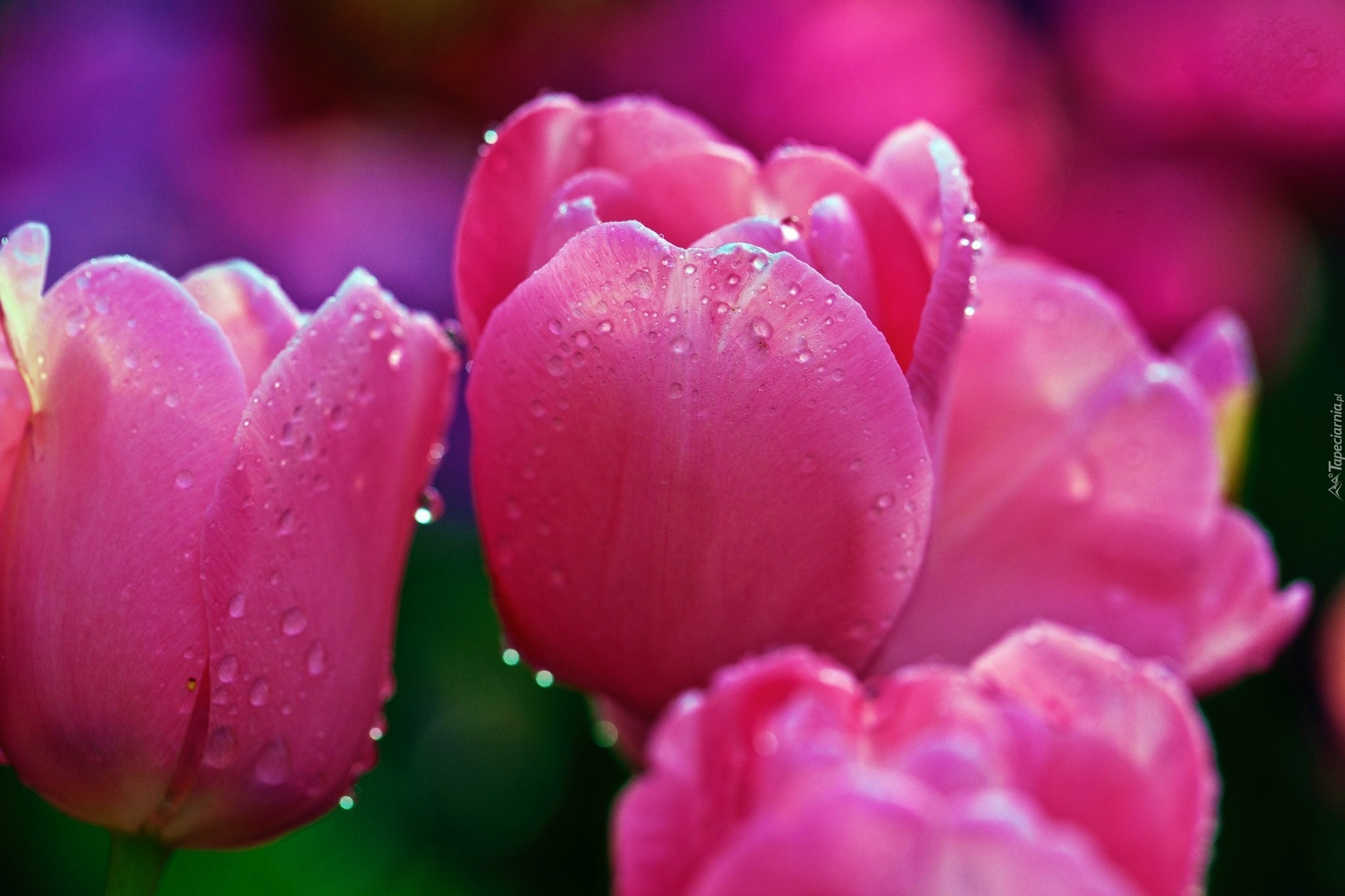 Edytor tapety: Różowe, Tulipany, Krople, Rosy