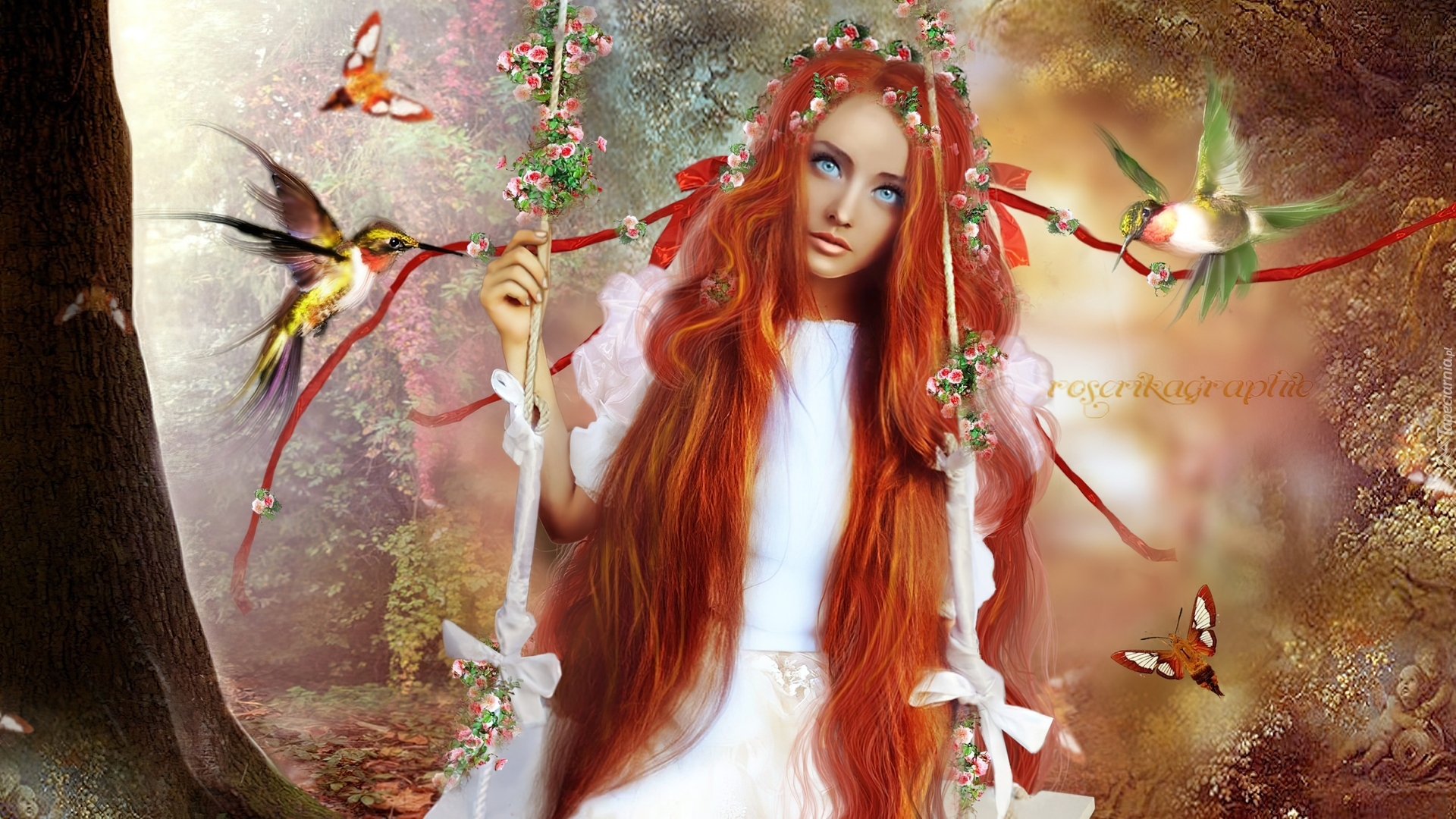 Edytor tapety: Fantasy, Kobieta, Ptaki, Huśtawka