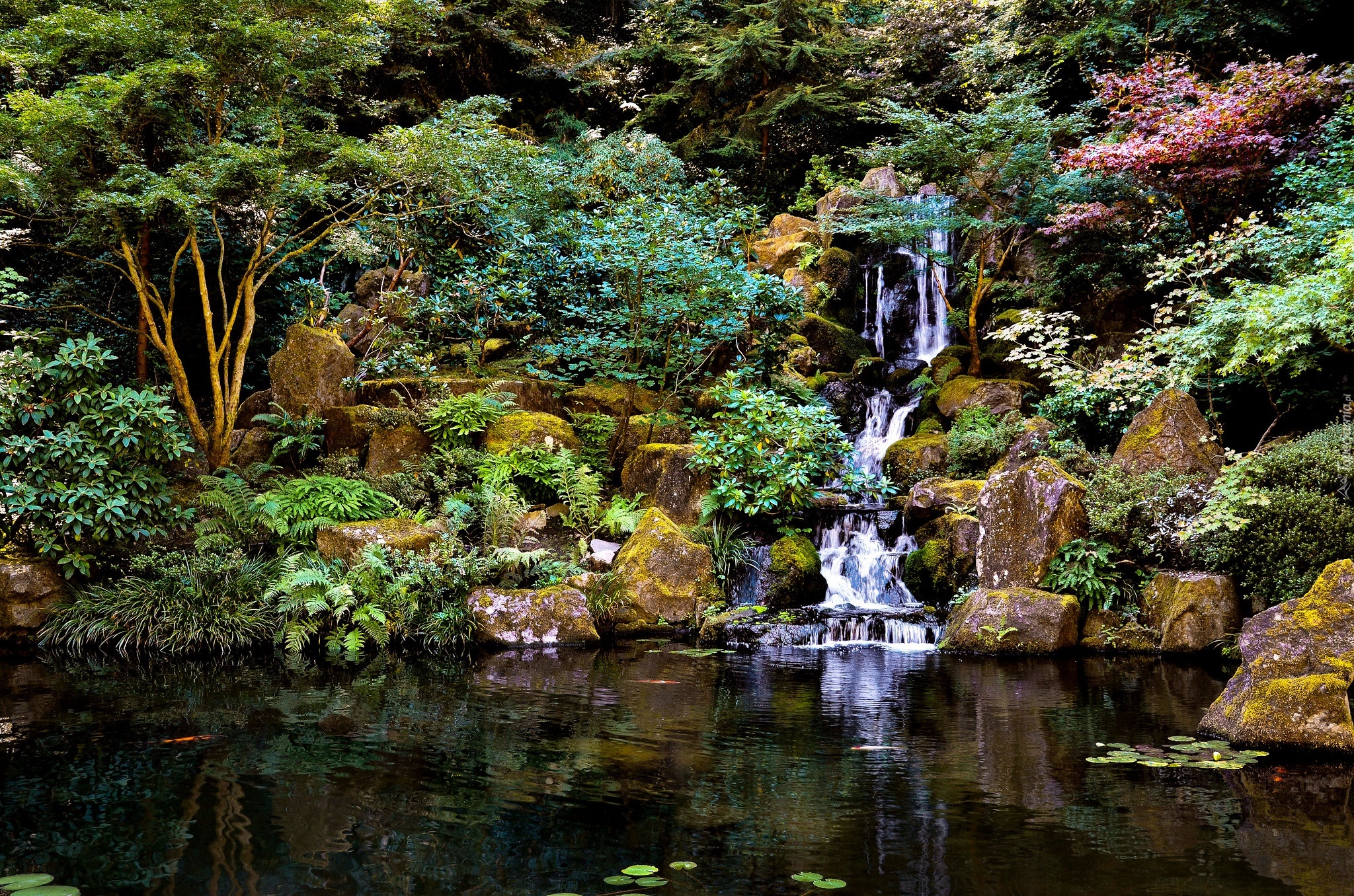 Edytor tapety: Japoński, Ogród, Wodospad, Drzewa, Staw