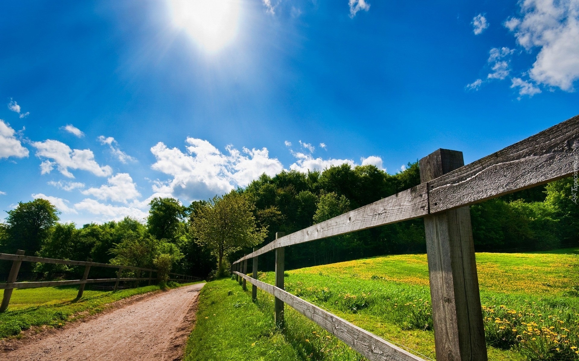 Edytor tapety: Droga, Łąka, Ogrodzenie, Promienie Słońca