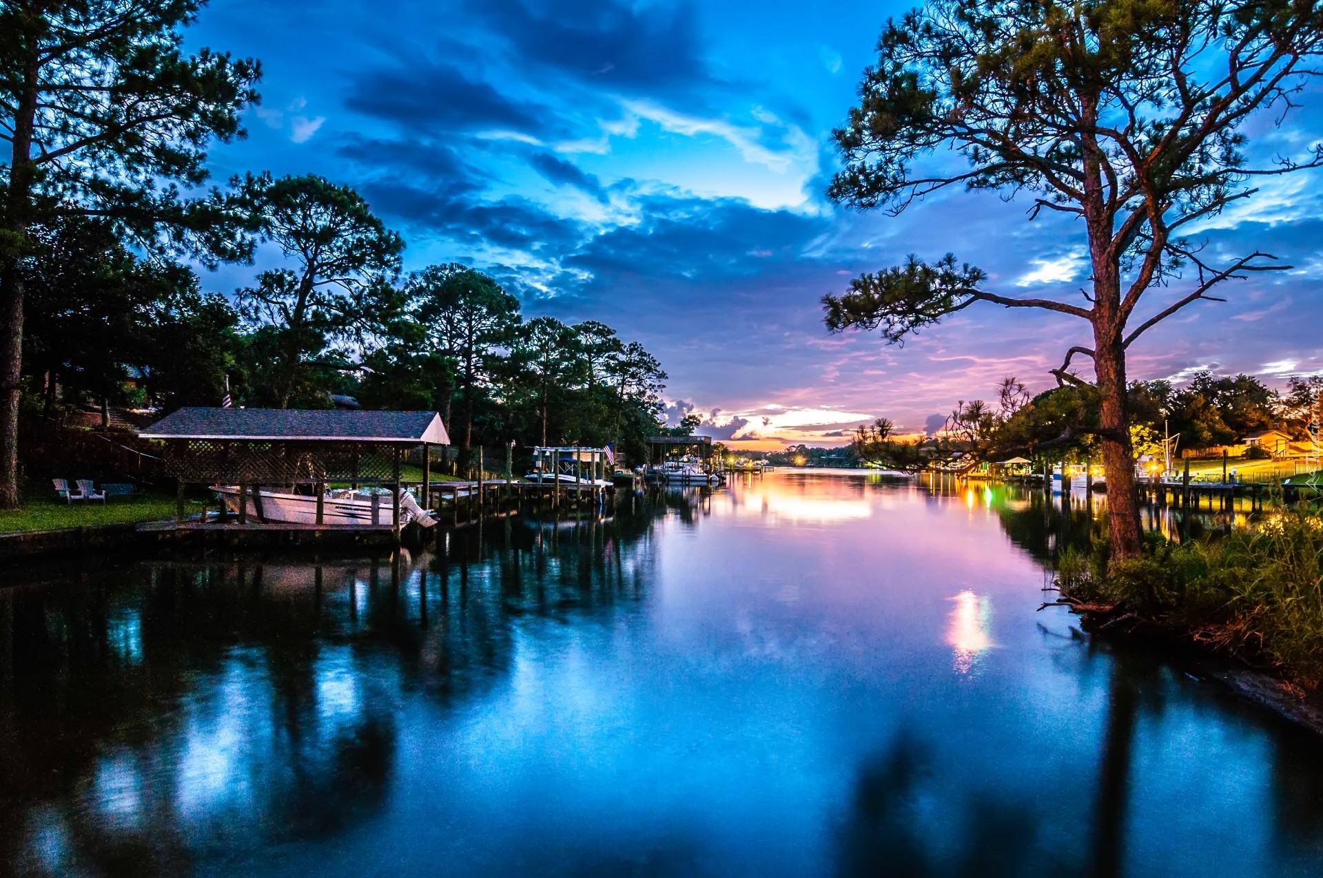 Edytor tapety: Jezioro, Niebo, Drzewa, Odbicie, Zachód, Słońca