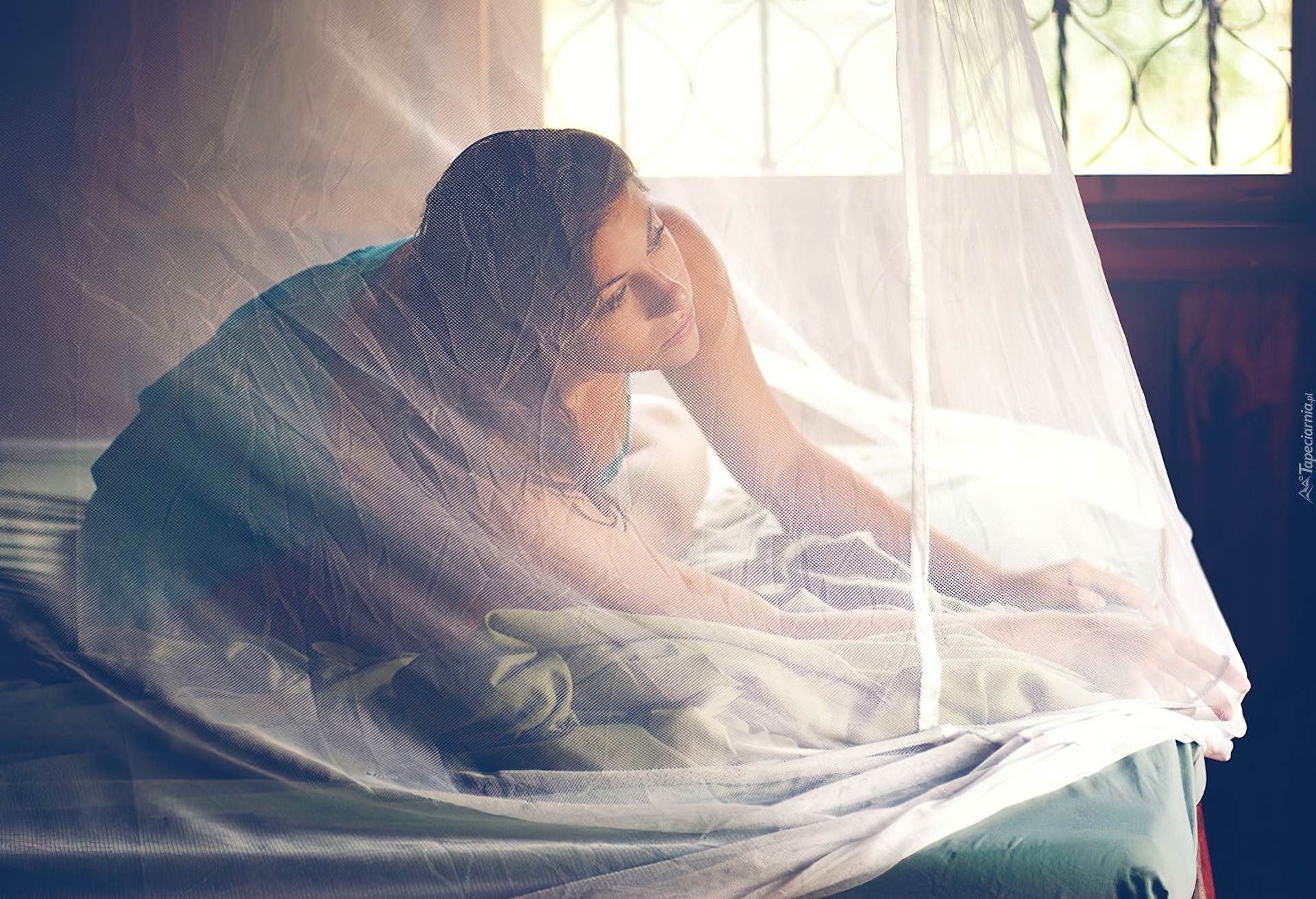 Edytor tapety: Kobieta, Brunetka, Łóżko, Zasłona