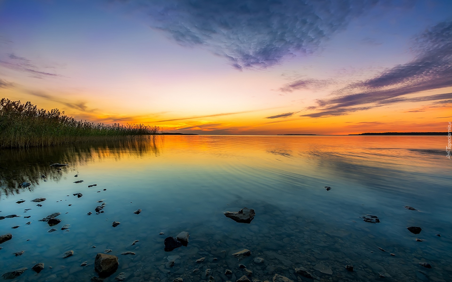 Edytor tapety: Jezioro, Szuwary, Zachód Słońca