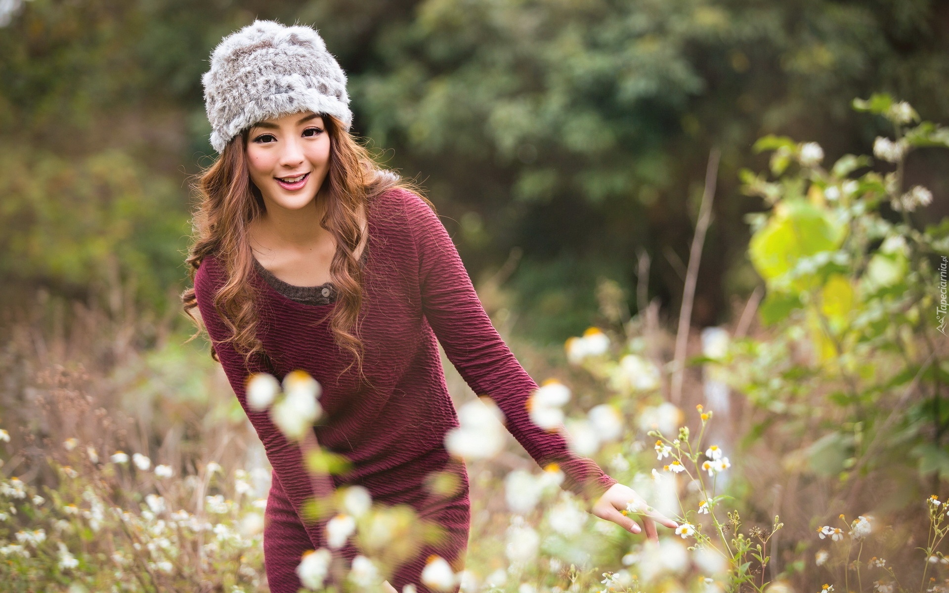 Edytor tapety: Młoda, Japoneczka, Las, Polana, Kwiaty
