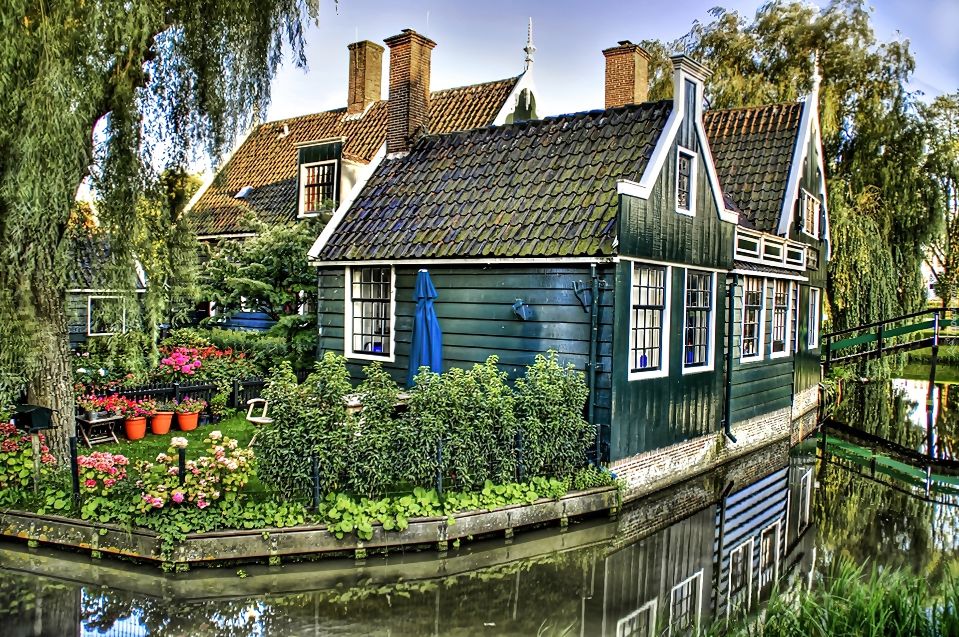 Edytor tapety: Domki, Ogródek, Kanał, Mostek