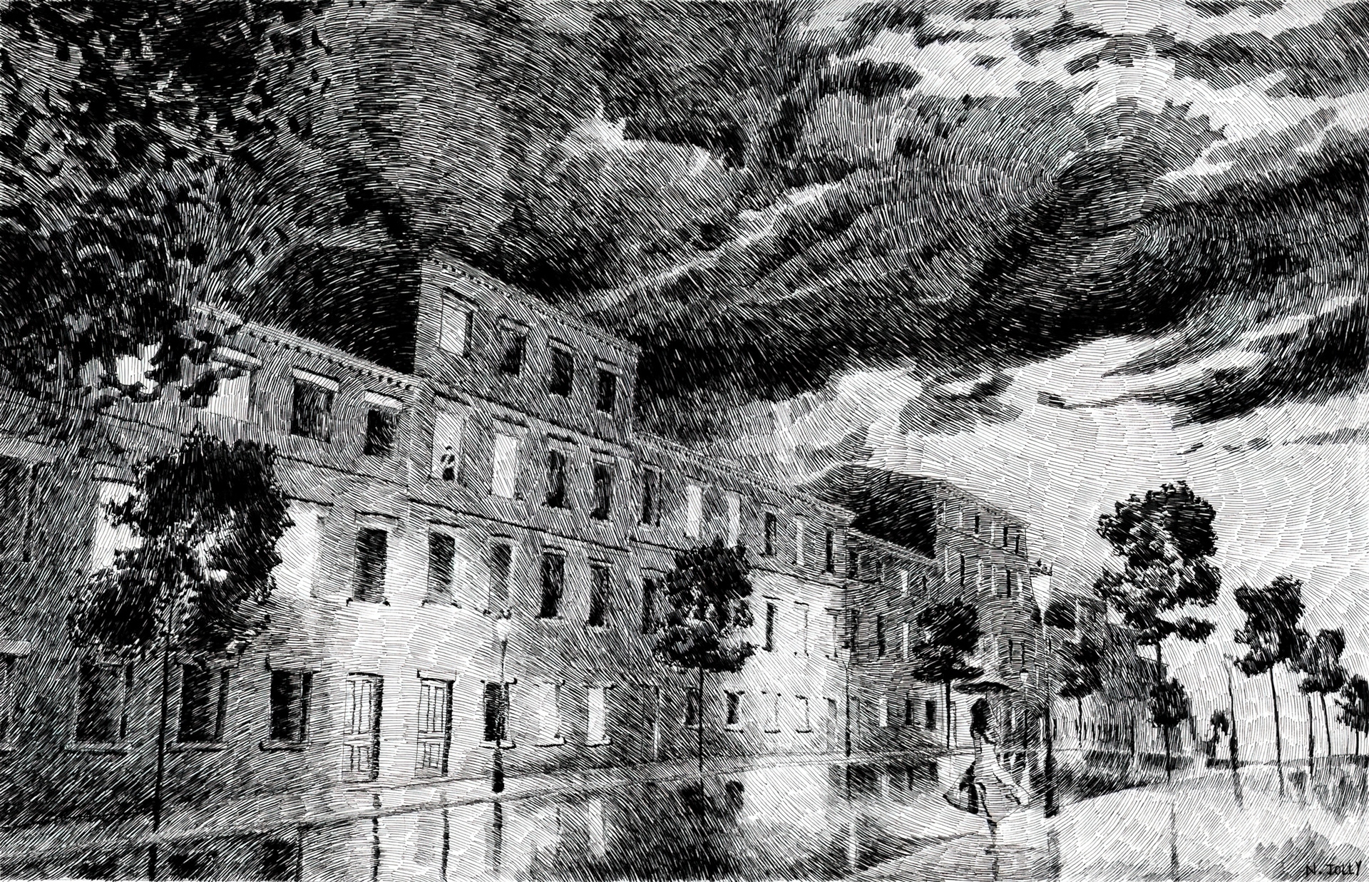 Edytor tapety: Nicolas Jolly, Budynek, Drzewa, Kobieta