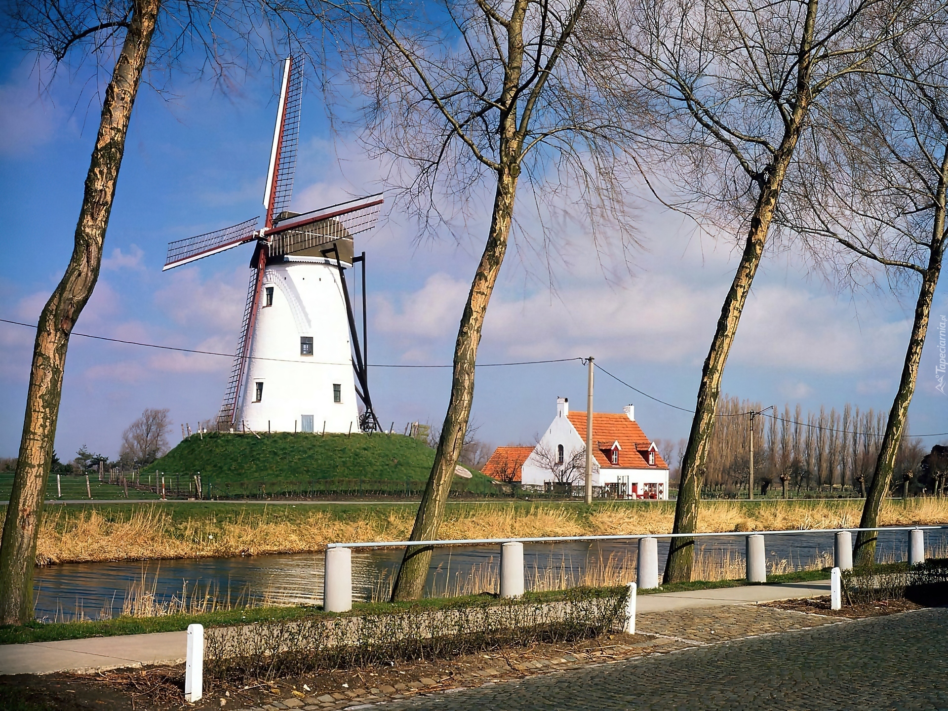 Edytor tapety: Wiatrak, Domy, Rzeka, Drzewa