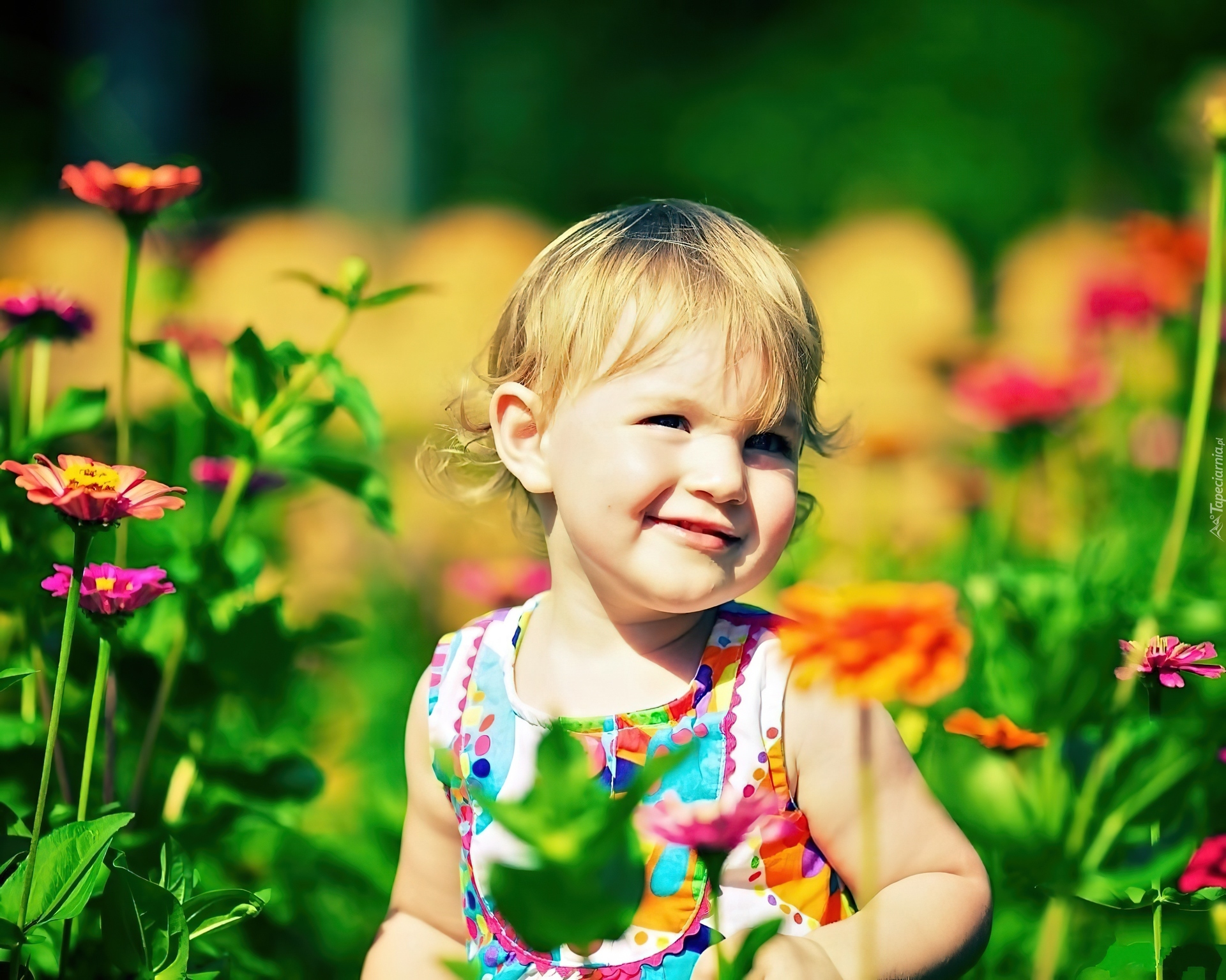 Edytor tapety: Ogródek, Kwitnące, Cynie, Uśmiechnięta, Dziewczynka