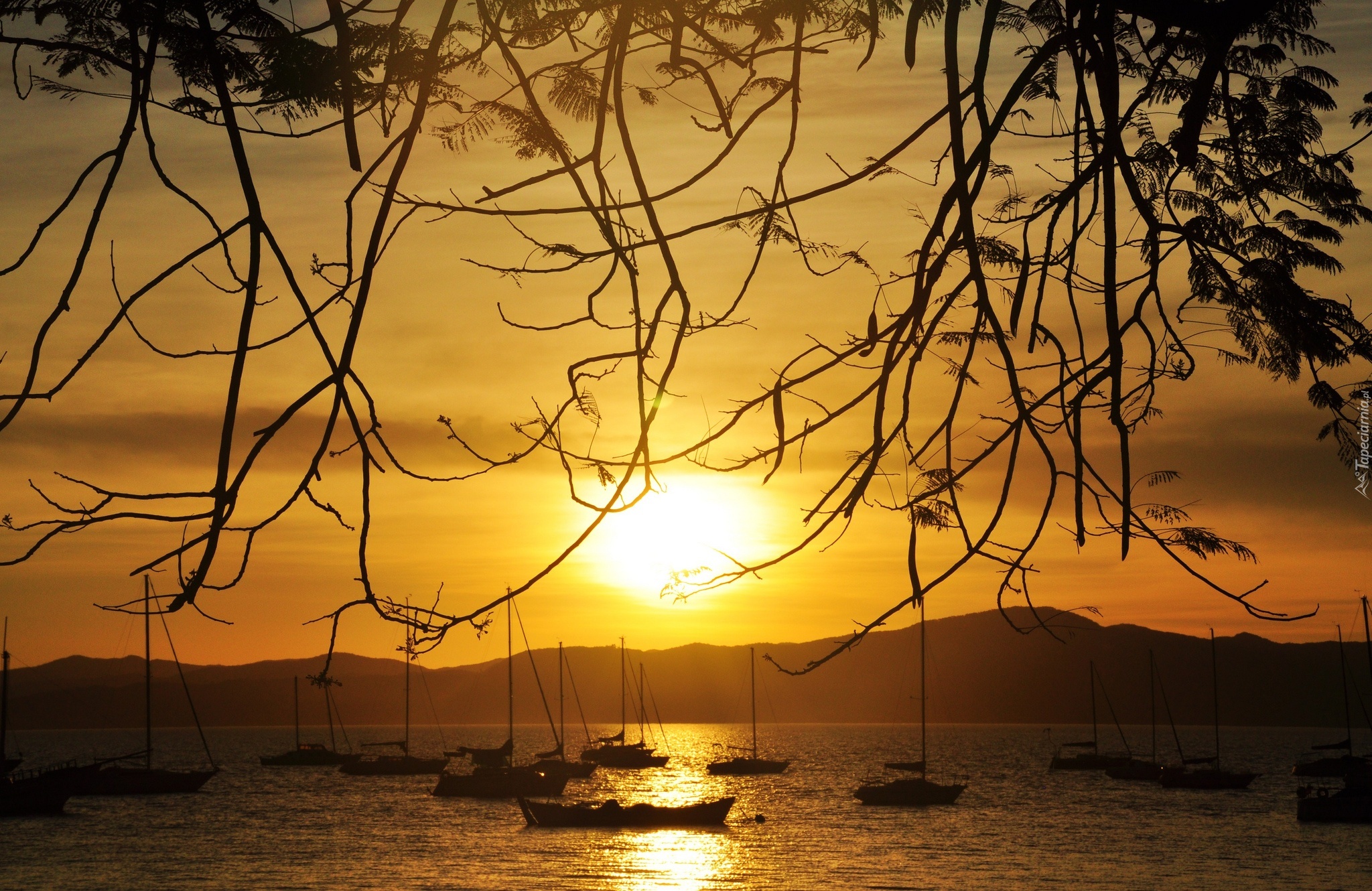 Edytor tapety: Jezioro, Łodzie, Góry, Zachód, Słońca