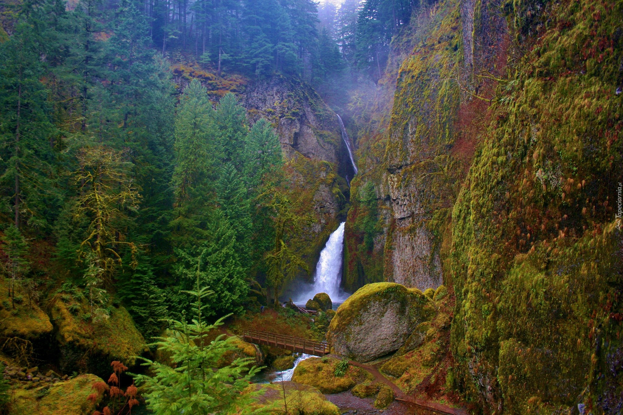 Edytor tapety: Wodospad, Skały, Las, Wahclella, Oregon