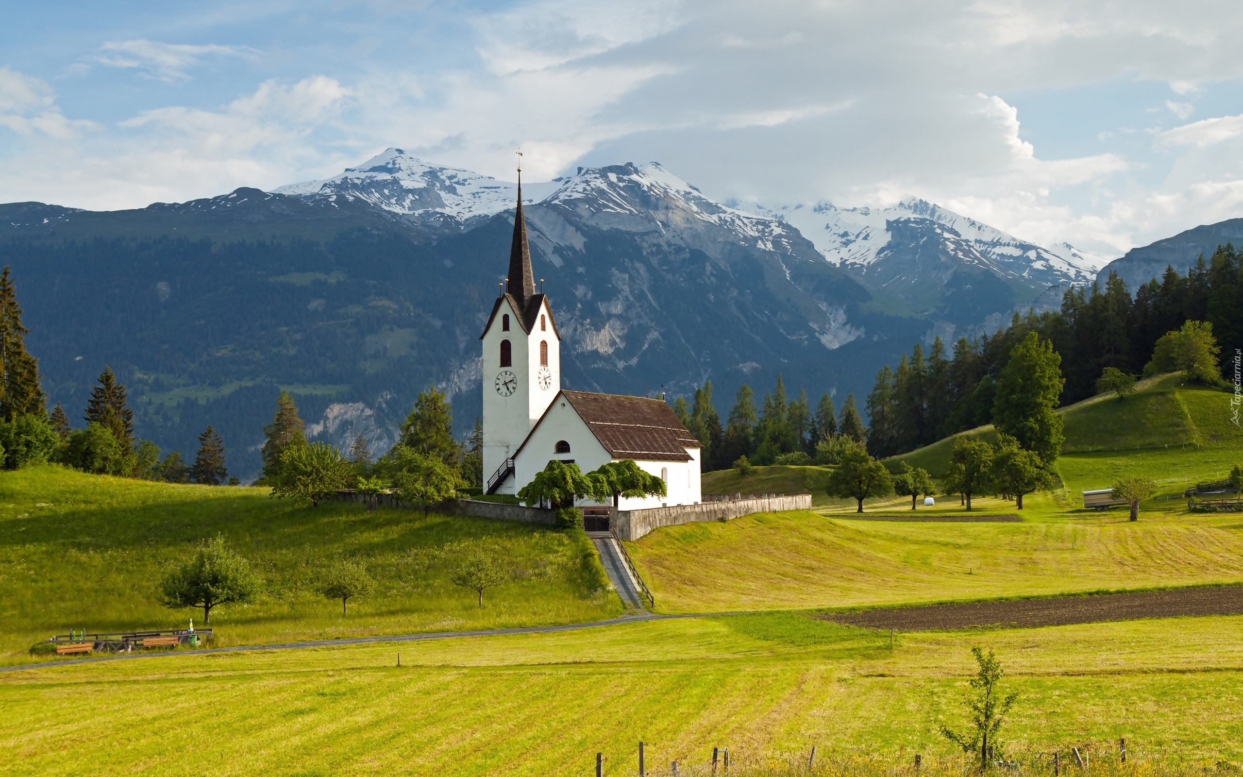 Edytor tapety: Kościółek, Góry, Lasy, Łąki