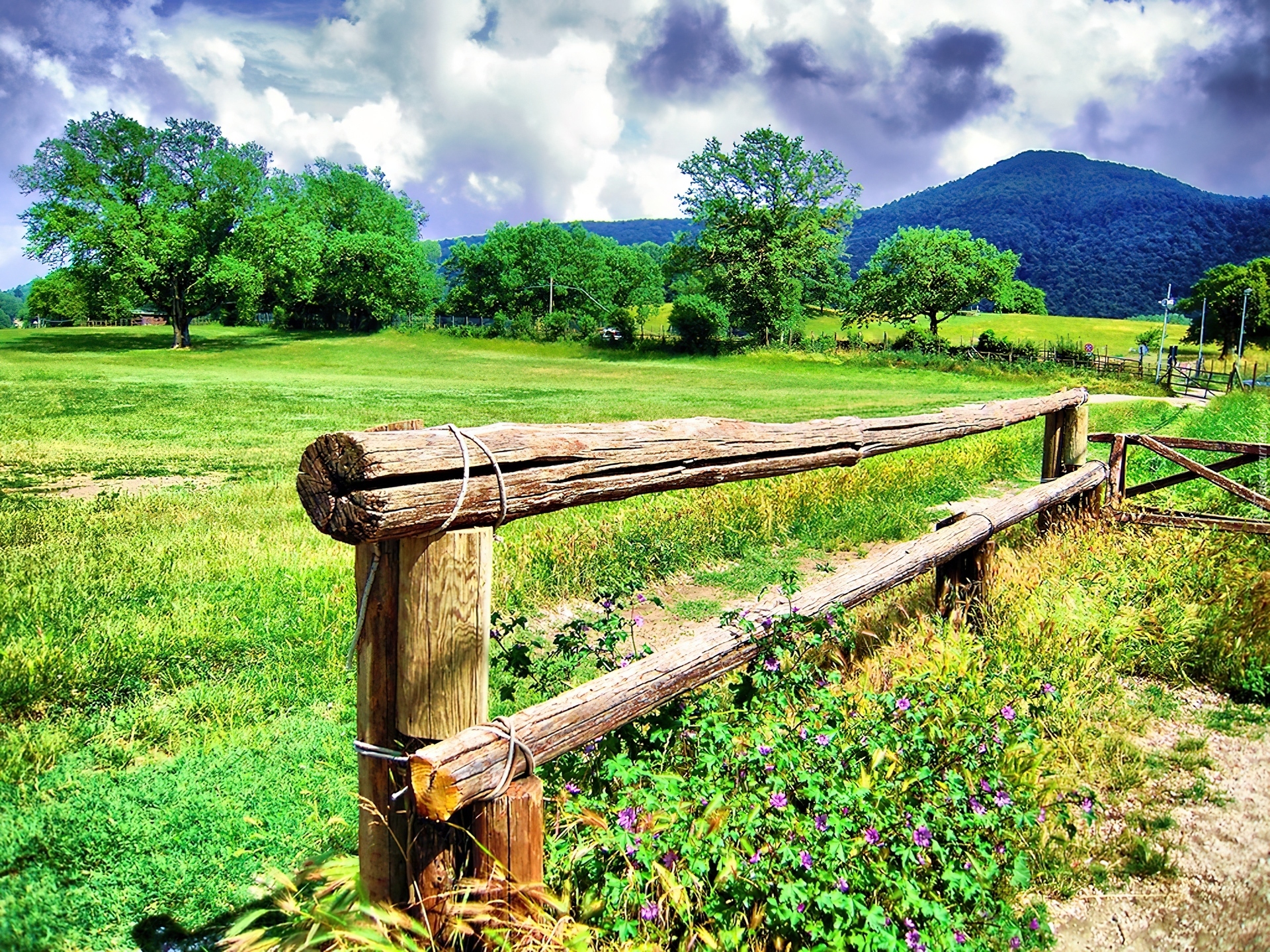 Edytor tapety: Wzgórza, Drzewa, Łąka, Ogrodzenie