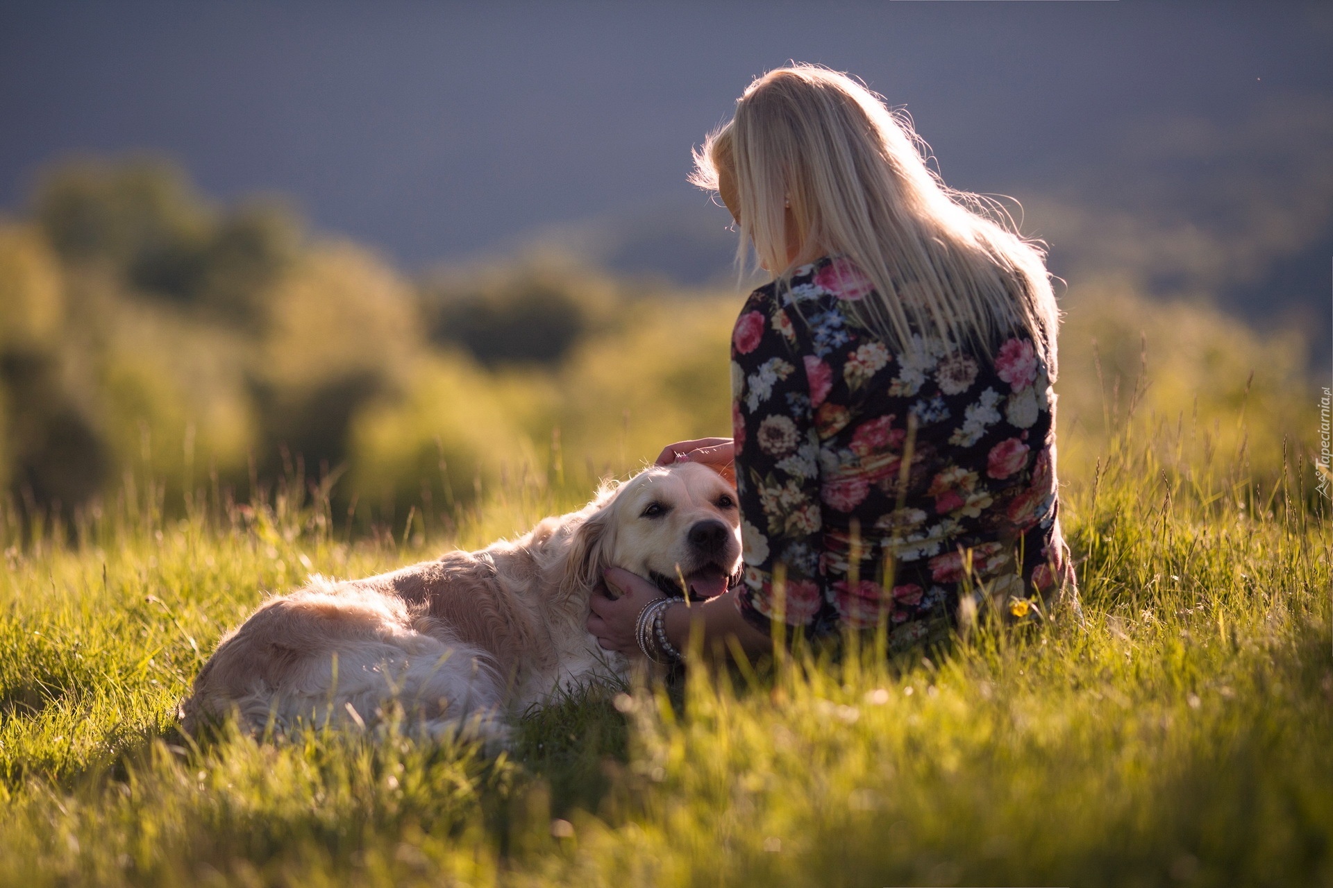 Edytor tapety: Dziewczyna, Golden Retriever, Łąka, Trawa