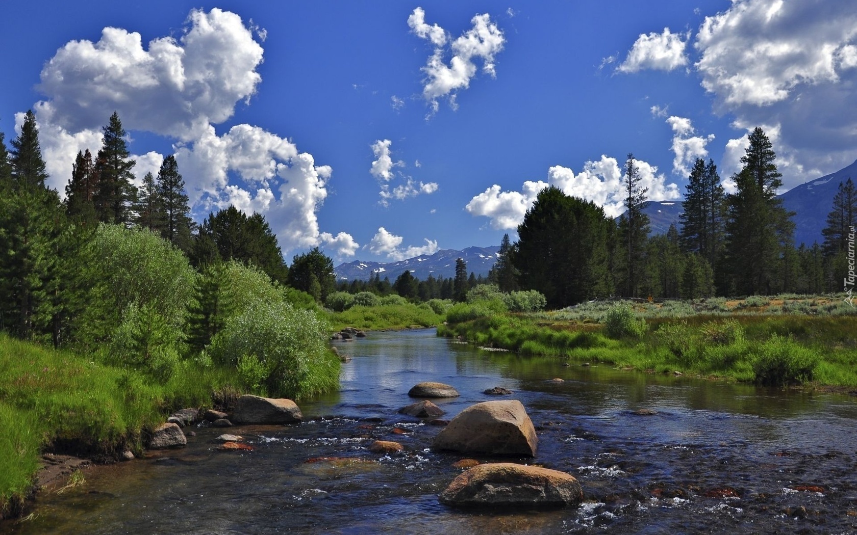 Edytor tapety: Rzeka, Góry, Lasy, Kamienie, Chmury