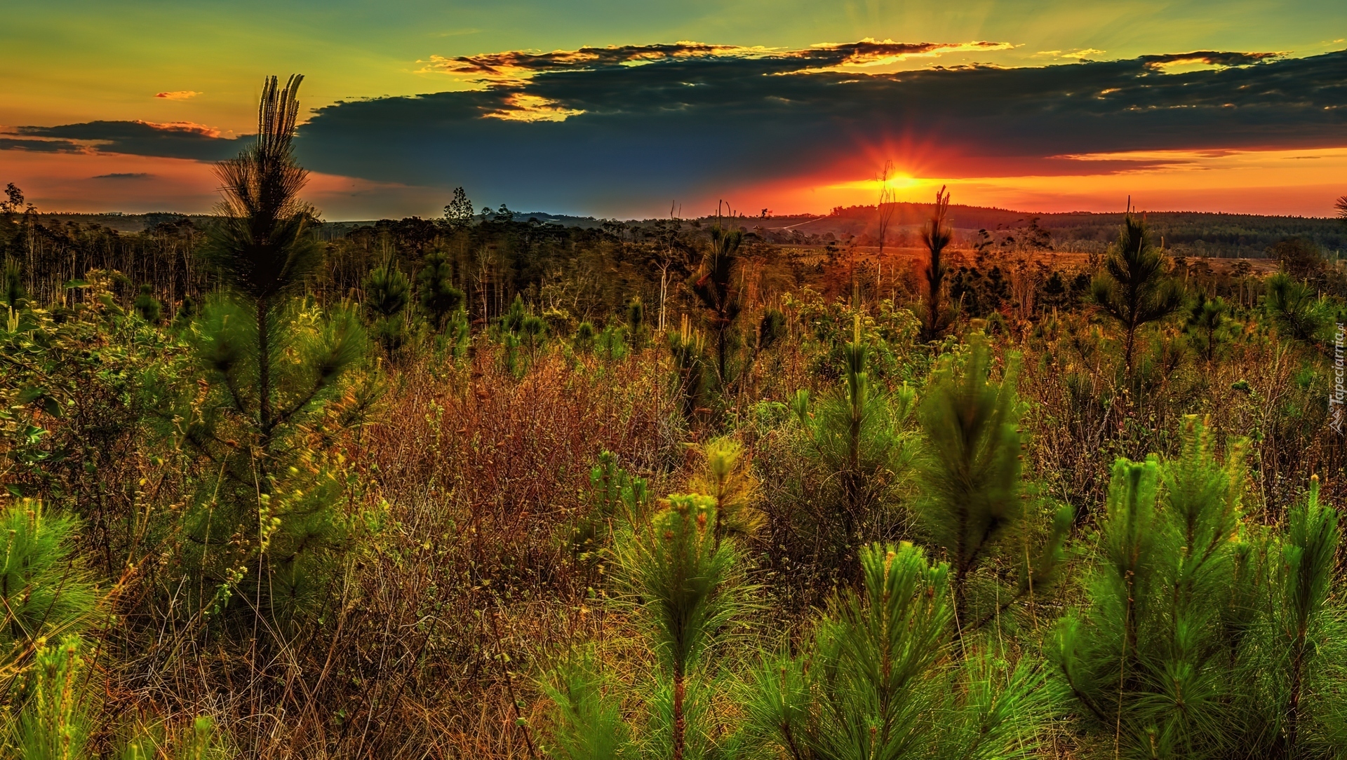 Edytor tapety: Zachód, Słońca, Iglaki