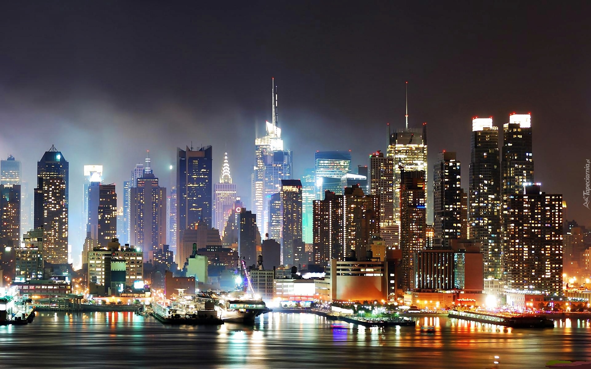 Edytor tapety: Miasto, Nocą, Drapacze, Chmur, Rzeka